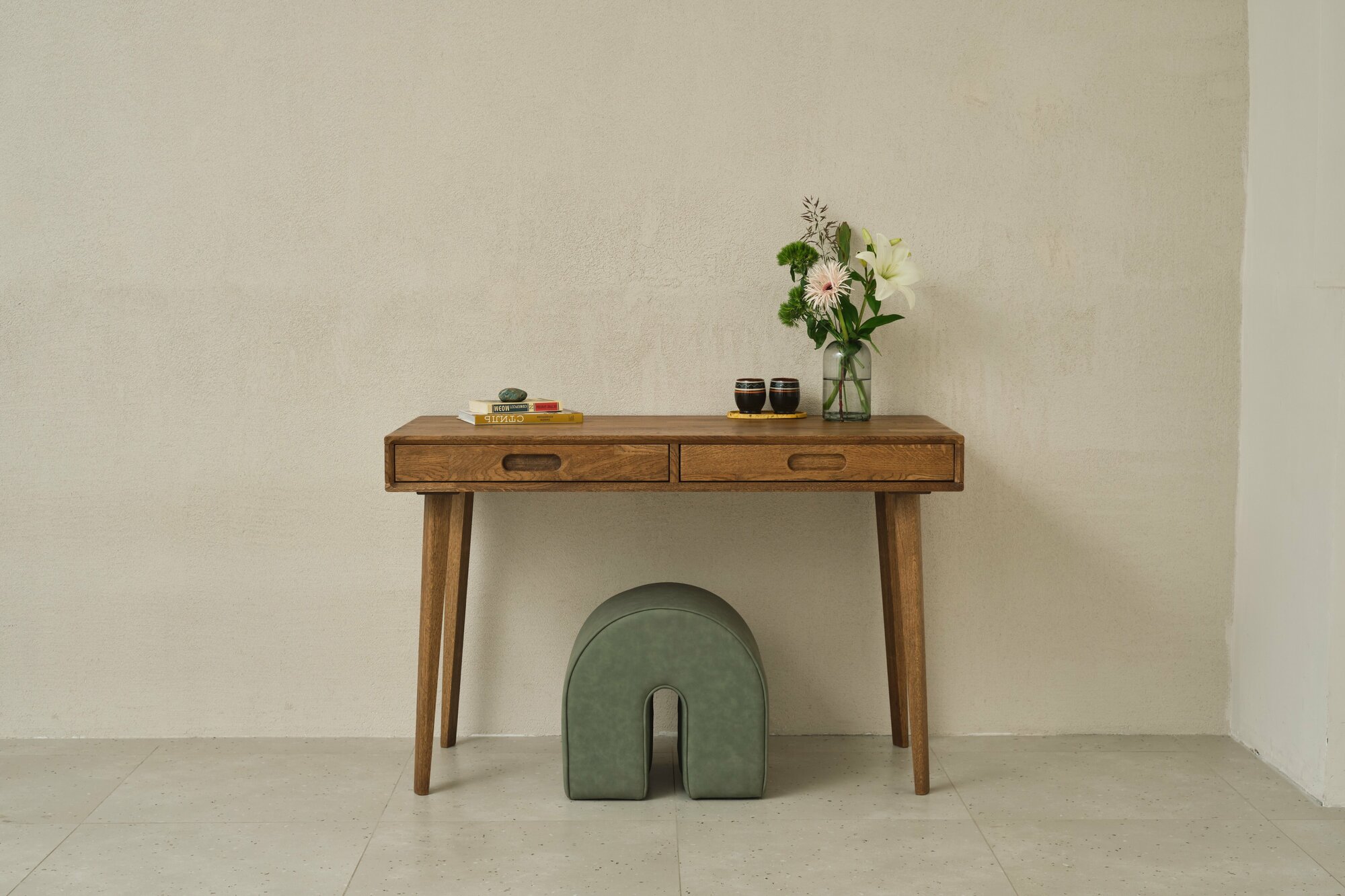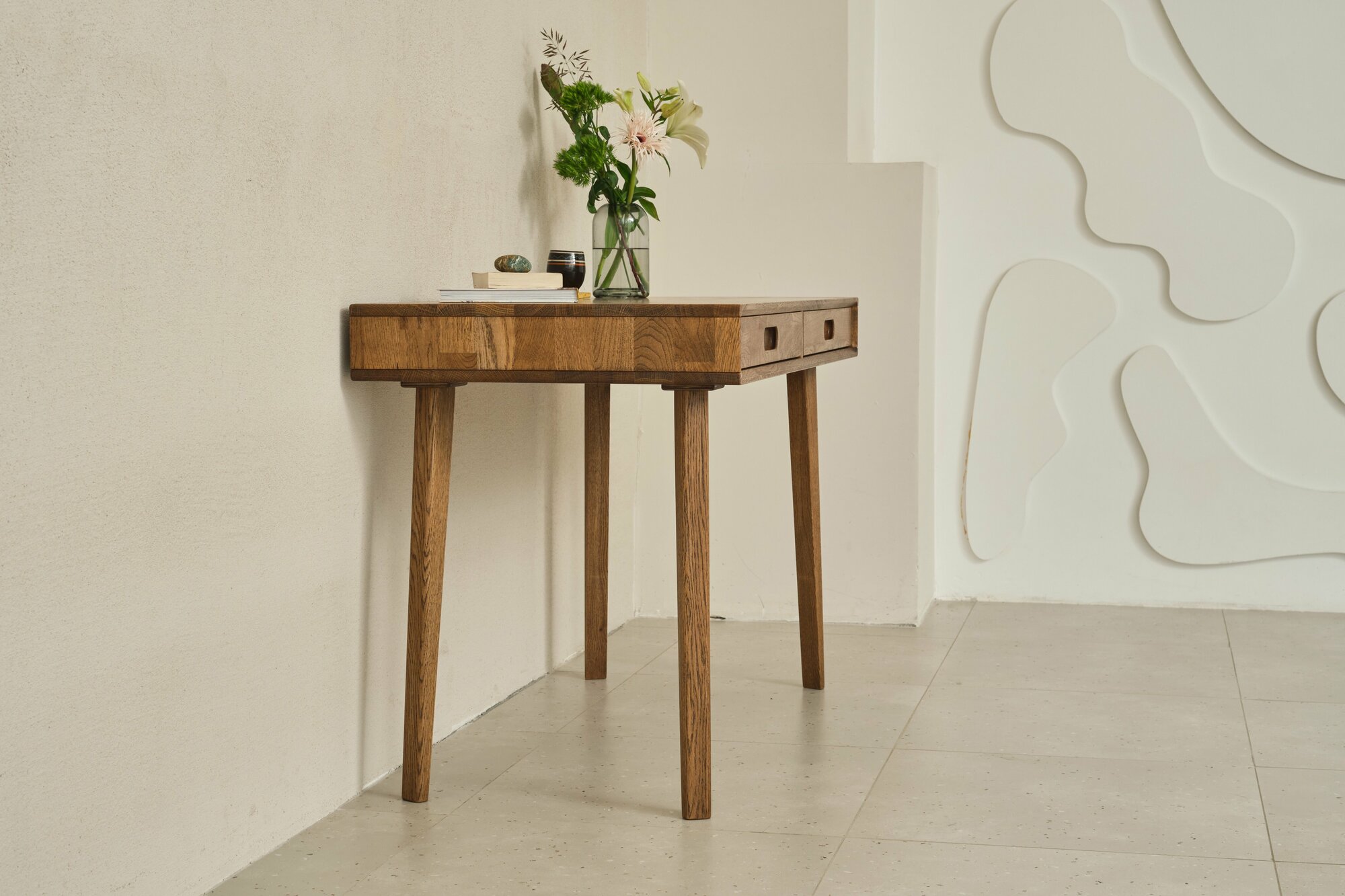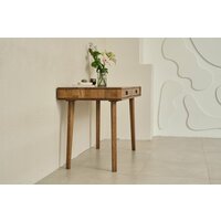 Лаконичный и удобный стол Fusion в стиле мидсенчури станет атмосферным дополнением вашего кабинета. На высоких тонких опорах, с двумя выдвижными ящиками, выразительной фрезеровкой корпуса. Он может быть использован как для работы, так и творчества