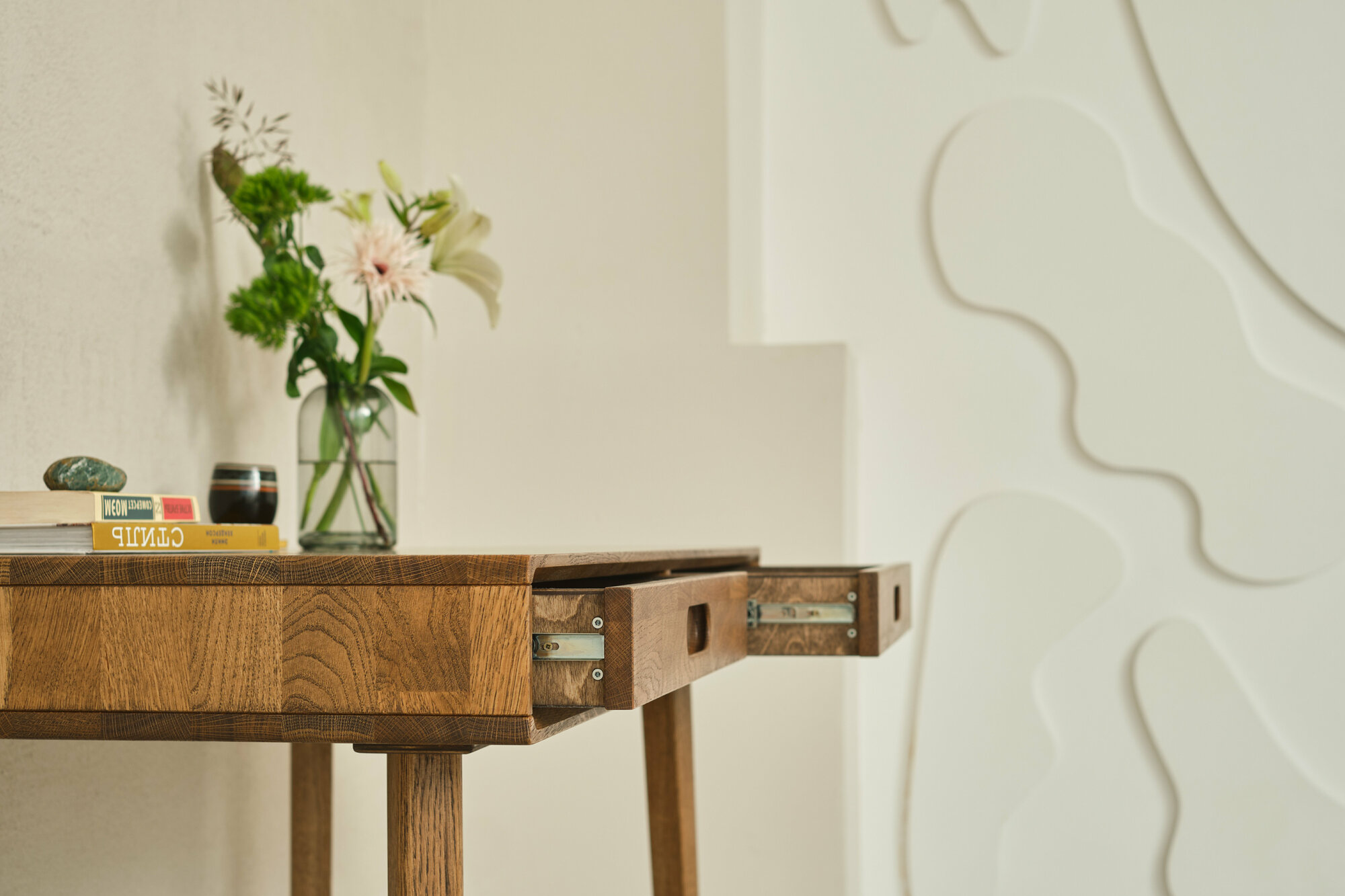Масло проникает в саму структуру древесины, массив дуба красиво раскрывает свой рисунок, финиш даёт защиту, а само изделие сохраняет тактильные свойства природного материла — его очень приятно касаться