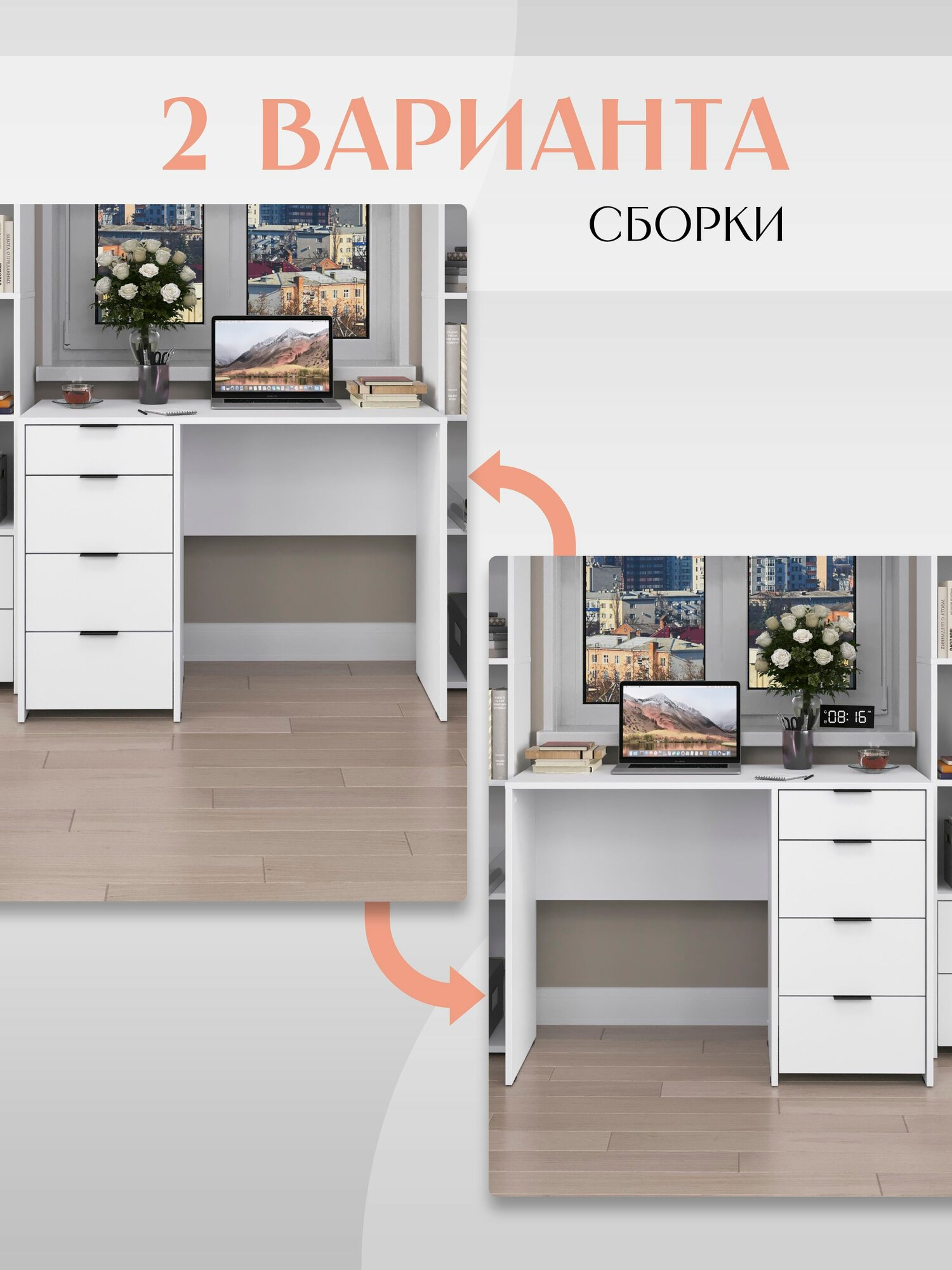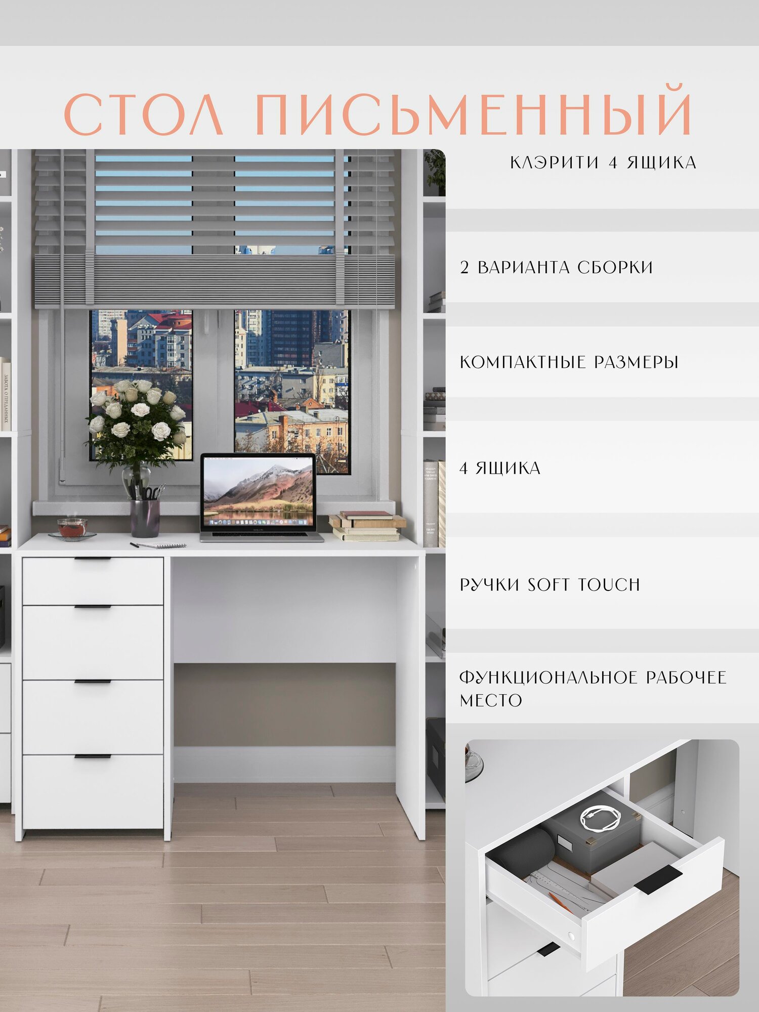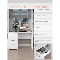 * Функциональность. Стол оснащён ящиками для хранения канцелярских принадлежностей, книг и других необходимых вещей. Это поможет поддерживать порядок и организованность рабочего пространства.