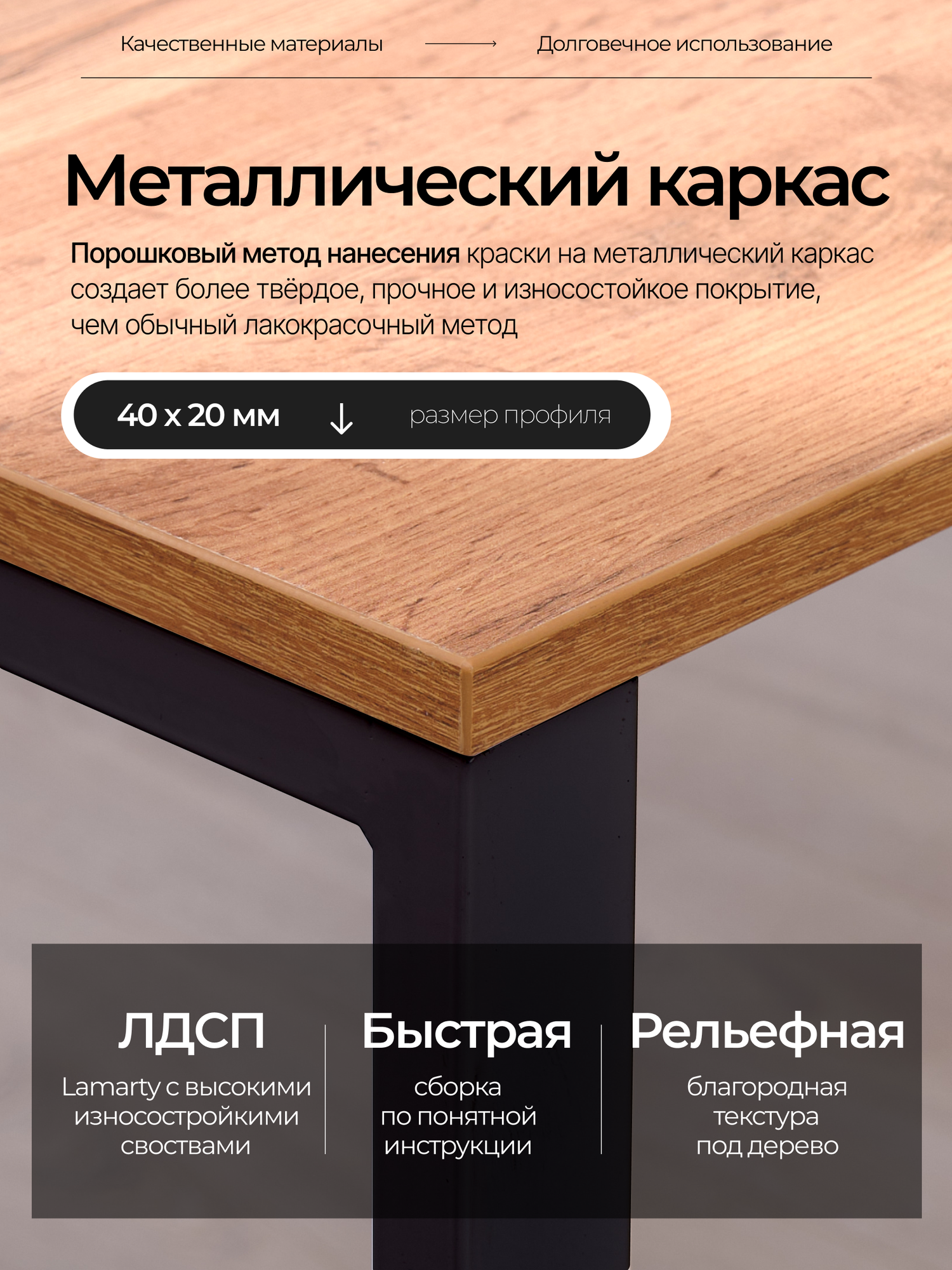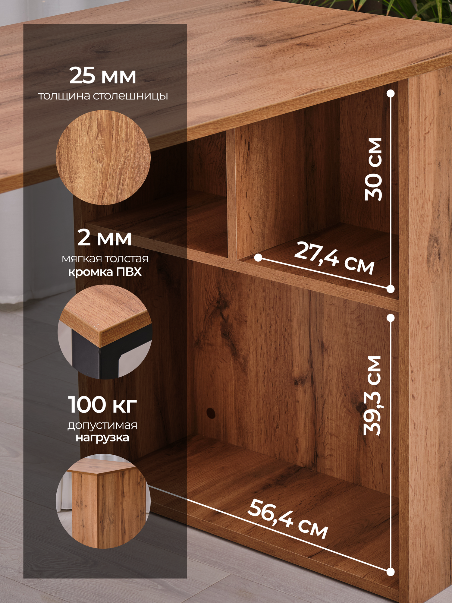 Столешница изготовлена из высококачественного ЛДСП компании Lamarty толщиной 25 мм, края обработаны ПВХ кромкой, толщиной 2мм. Поверхность столешницы обладает устойчивостью к воздействию моющих средств, стойкостью к стиранию, царапинам и выцветанию.