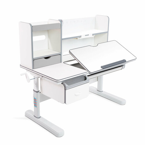 Столешница разделена на две части. Подвижная часть может изменять угол наклона до 60 градусов с помощью газлифта. Для предотвращения скатывания предметов предусмотрен прорезиненный барьер. Это удобно для выполнения домашних заданий и работы за столом, будь то школьные уроки, учеба, развивающие занятия с игрушками Mонтессори или рисование кисточками, занятия творчеством.