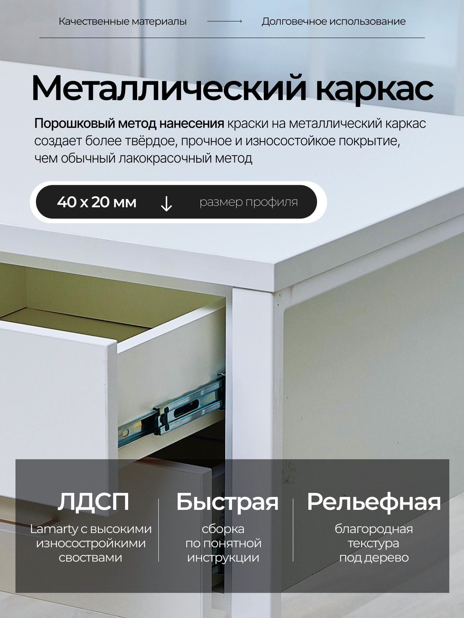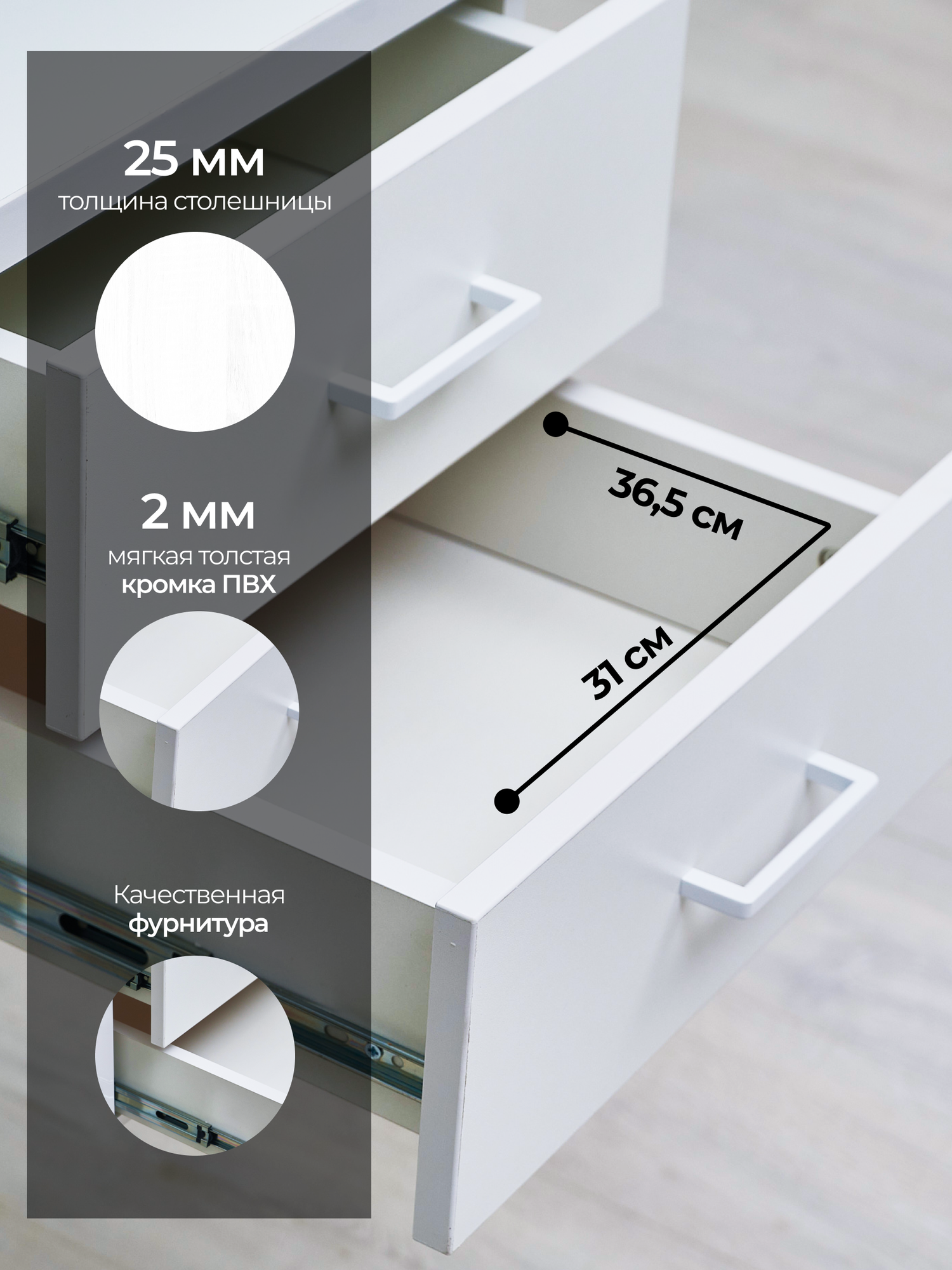 Столешница изготовлена из высококачественного ЛДСП компании Lamarty толщиной 26 мм, края обработаны ПВХ кромкой, толщиной 2мм. Поверхность столешницы обладает устойчивостью к воздействию моющих средств, стойкостью к стиранию, царапинам и выцветанию.