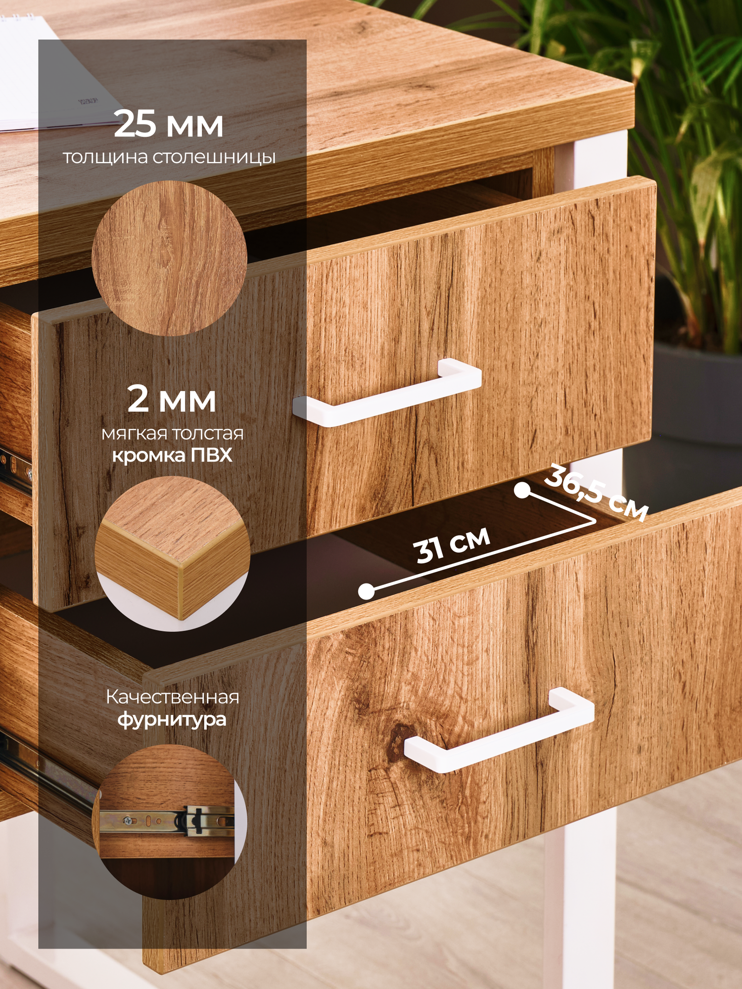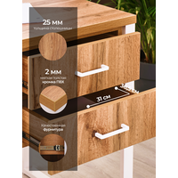 Столешница изготовлена из высококачественного ЛДСП компании Lamarty толщиной 26 мм, края обработаны ПВХ кромкой, толщиной 2мм. Поверхность столешницы обладает устойчивостью к воздействию моющих средств, стойкостью к стиранию, царапинам и выцветанию.