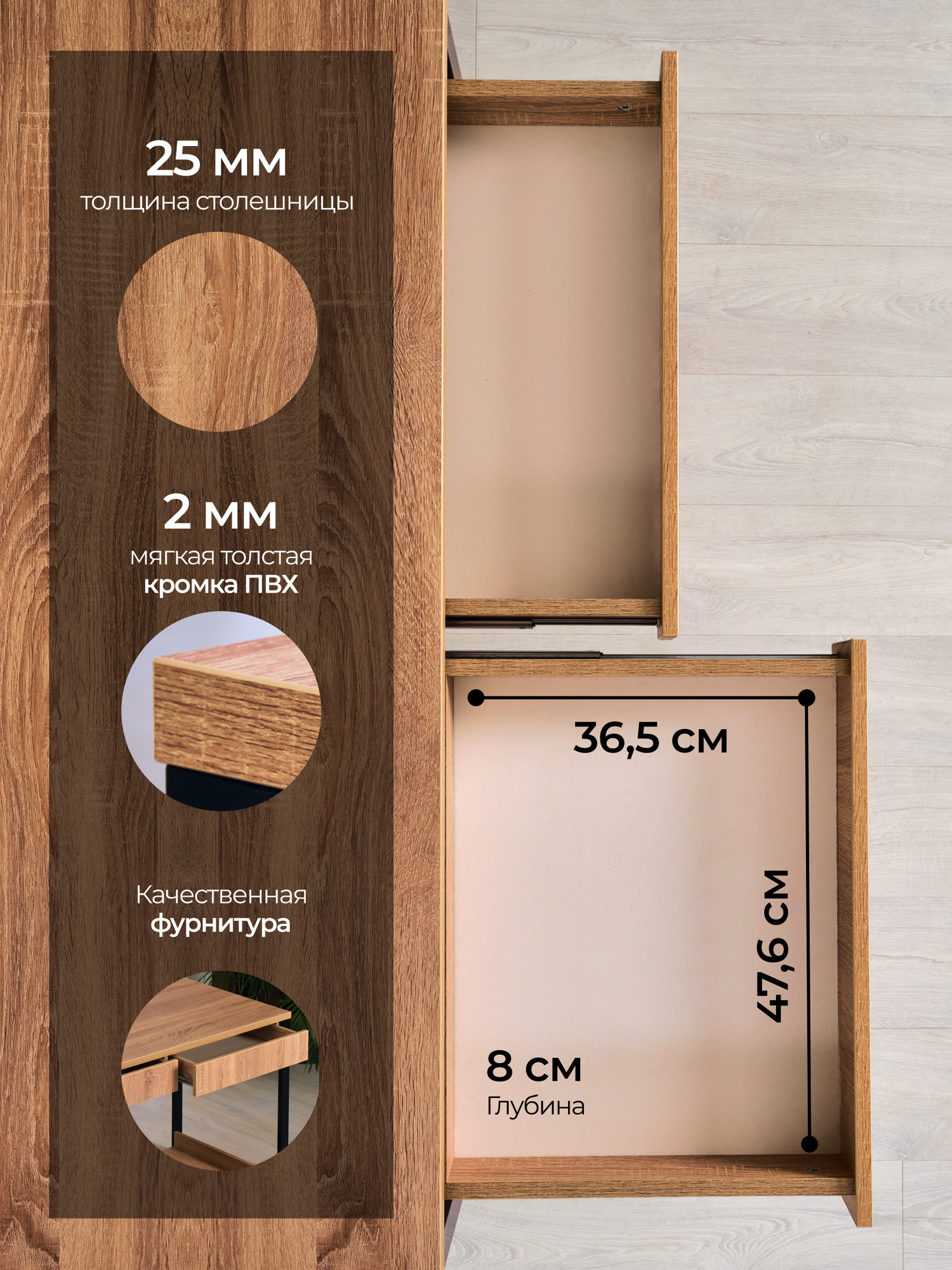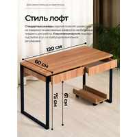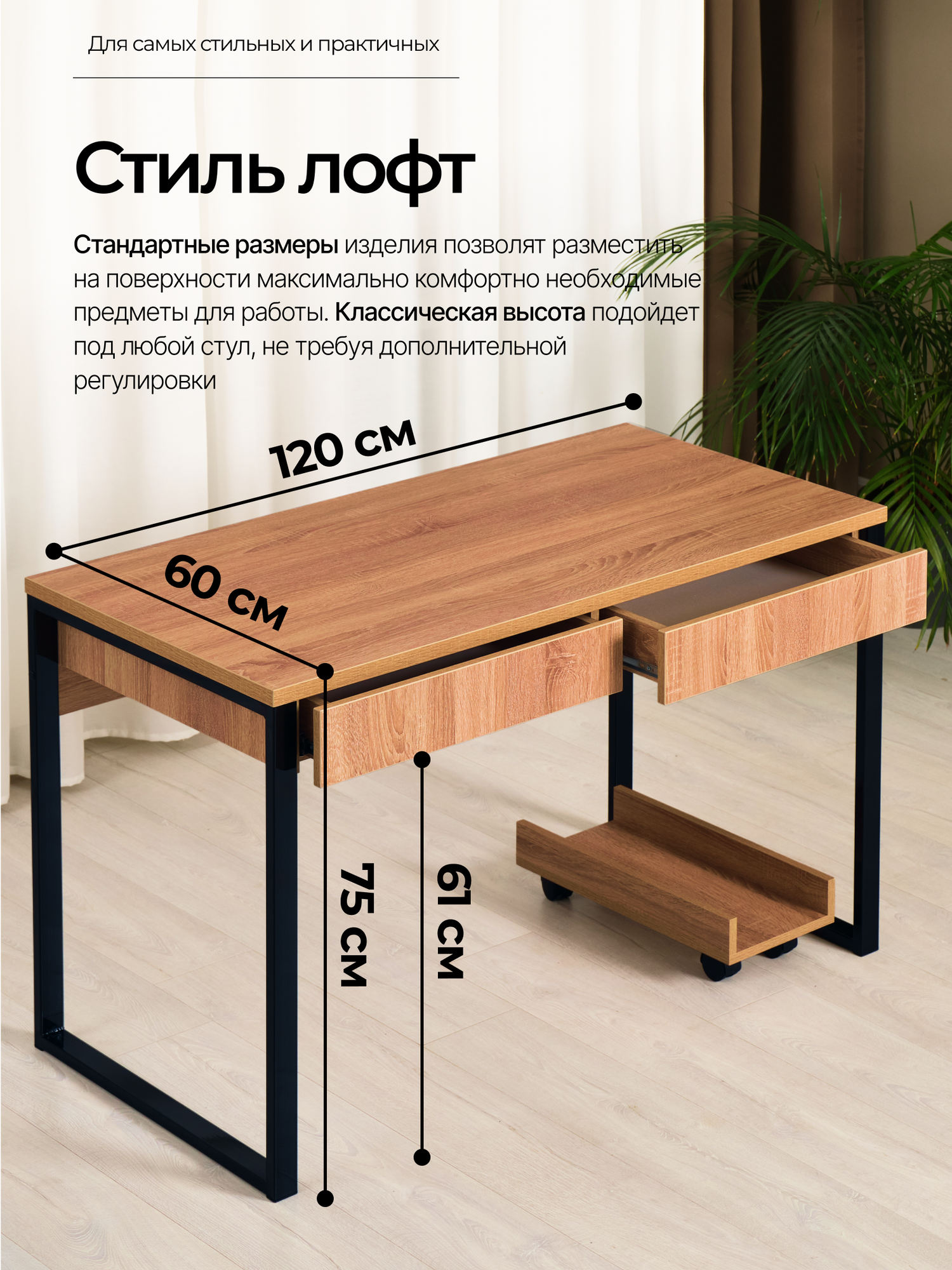 Письменный стол с тумбой выполненный в стиле Лофт идеально впишется в интерьер современного дома. Размеры стола (ДхШхВ): 120х60х75 см. Столешница изготовлена из высококачественного ЛДСП компании Lamarty толщиной 26 мм, края обработаны ПВХ кромкой, толщиной 2мм. Поверхность столешницы обладает устойчивостью к воздействию моющих средств, стойкостью к стиранию, царапинам и выцветанию. 2 удобных ящика для документов и канцелярских принадлежностей. Подстолье состоит из двух сварных ножек, изготовленных из металлической трубы 40х20х1,5 мм и покрашено порошковой краской. В комплект фурнитуры входят 4 пластиковых подпятника, благодаря которым можно поставить стол даже на неровном полу и не испортить напольное покрытие.