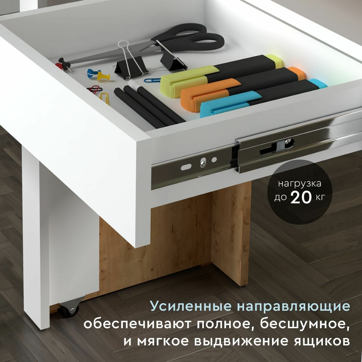 Стол заменит Вам туалетный столик, письменный стол, рабочее место, уютный уголок для творчества и сэкономит пространство. Стол-трансформер оснащен двумя вместительными ящиками для удобного хранения различных предметов и удобной выдвижной нишей, чтобы все было под рукой во время работы. Благодаря усиленным шариковым направляющим ящики выдвигаются полностью и бесшумно.