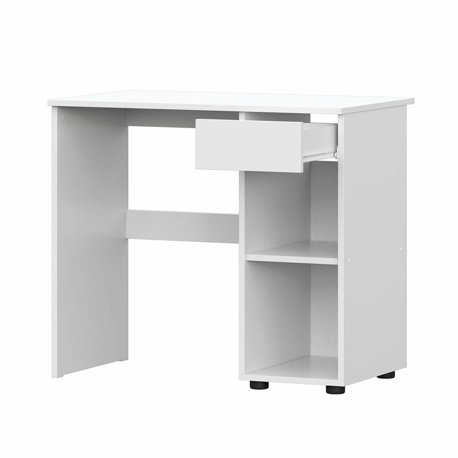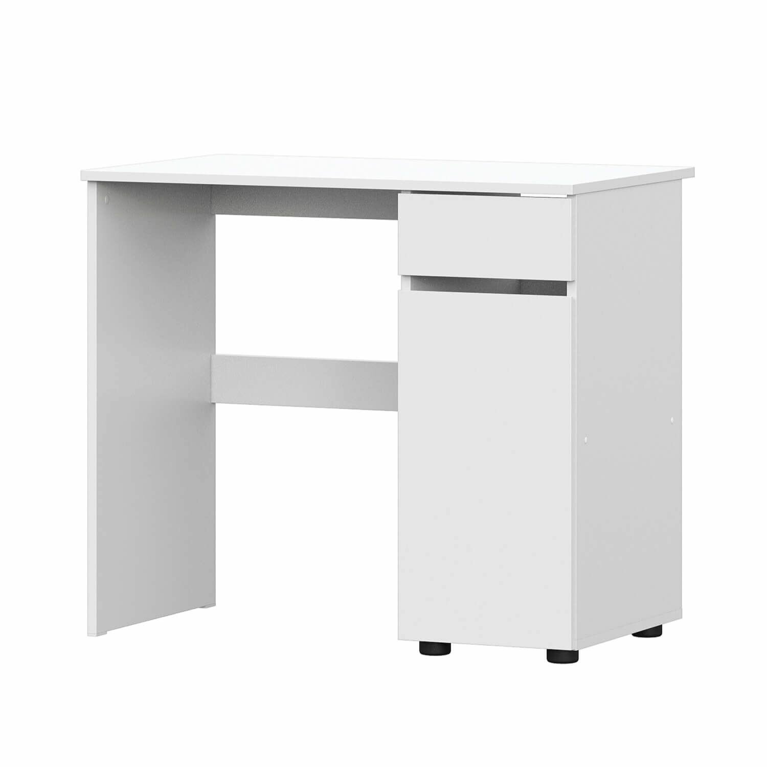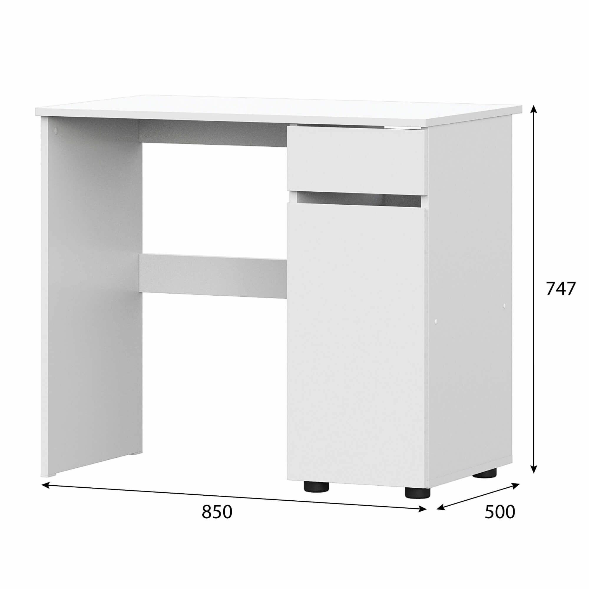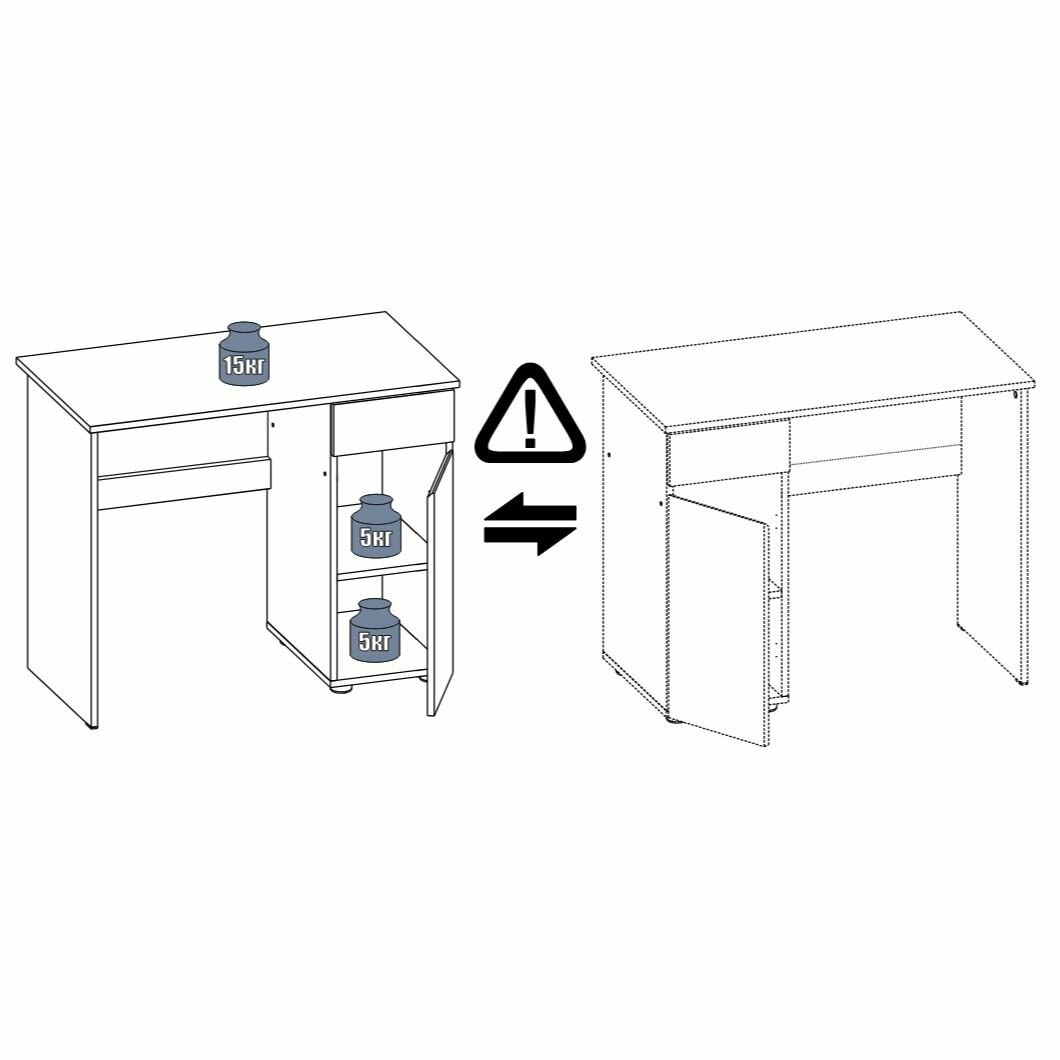 Стол письменный Токио (ШхВхГ) 860х750х500 мм Стол включает в себя тумбу с выдвижным ящиком в верхней части и нишу с полкой и распашной створкой. Тумба может располагаться с правой и с левой стороны стола. Внутренние габариты ящика: (ШхВхГ) — 212х80х304 мм. Фасады ящика и ниши не имеют ручек, открываются на скос в верхней части фасадов. Между фасадами ящика и створки имеет- ся зазор. Направляющие ящика роликовые. Боковые стенки стола крепятся между собой 2 планками. Корпус ЛДСП 16 мм Белый текстурный. Максимальная нагрузка на крышку 15 кг. Стол устанавливается на опорах. Сборка универсальная (на любую сторону).