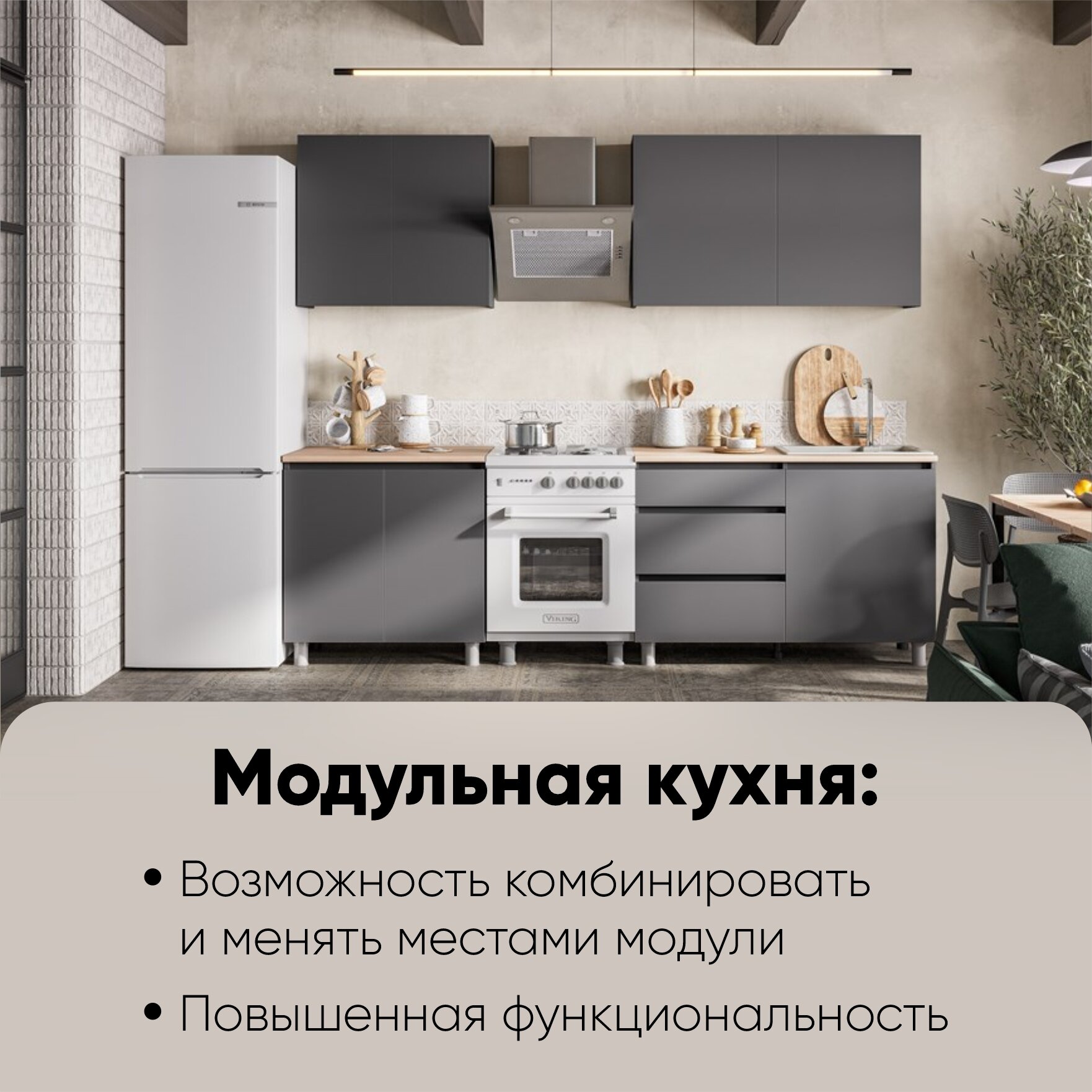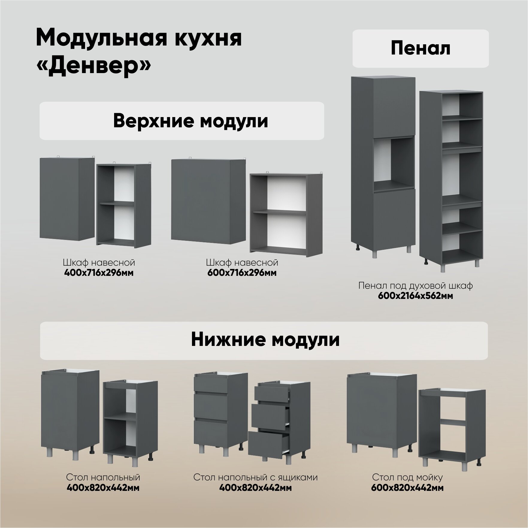 Кухонные модули Денвер: стиль, качество и доступная цена – идеальное решение для создания стильного и функционального интерьера кухни. Трендовый цвет - графит серый: серый матовый цвет является одним из самых популярных трендов в дизайне интерьеров. Он придает кухне элегантность и сдержанность. Открытие за свес двери- удобная система открытия дверей позволяет максимально использовать пространство кухни.
