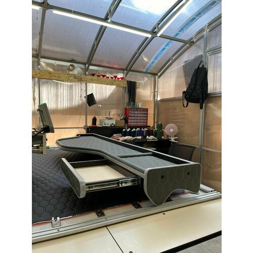 Стол-полка с ящиком на торпеду для грузового автомобиля DAF 95/105 - это стильное и функциональное решение для водителей грузовиков. Изготовленная из высококачественной серой экокожи с узором в виде серых сот, полка не только выглядит роскошно, но и обеспечивает долговечность и практичность использования.