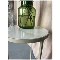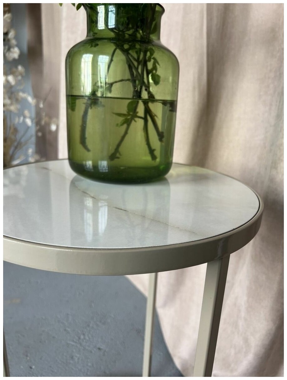 Стол журнальный прикроватный. Размеры: диаметр 35 см, высота 55 см. Материал столешницы керамогранит ONIX - керамогранит глянцевый, лёгкая текстура камня оникс. Основание: металлический профиль, сечение 15/15 или пруток 12 мм. Цвет основания: бежевый полуматовый, покраска порошковая. Керамогранит - красивый и прочный материал, имитирующий фактуру мрамора. Устойчив к царапинам, пятнам. Рисунок столешницы различается в каждом конкретном изделии ввиду уникальности и неповторимости материала. Количество прожилок мрамора, фактура И интенсивность рисунка может отличаться. Рекомендации по уходу: уборка влажной тряпочкой без использования агрессивных моющих средств.