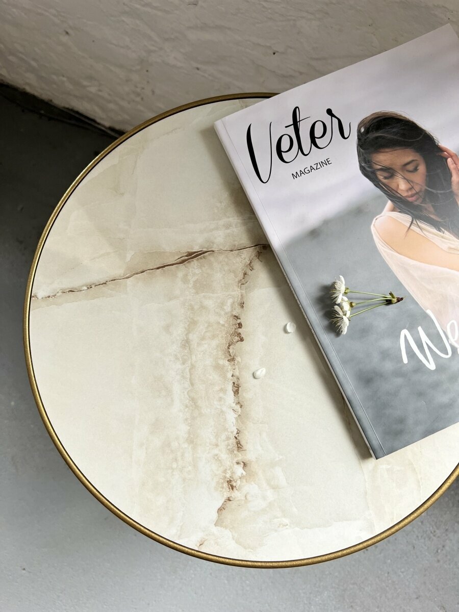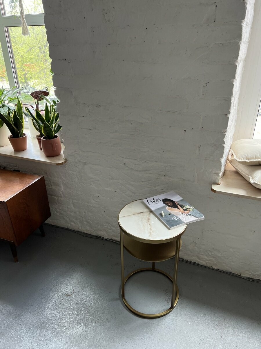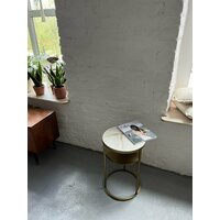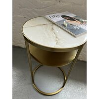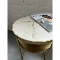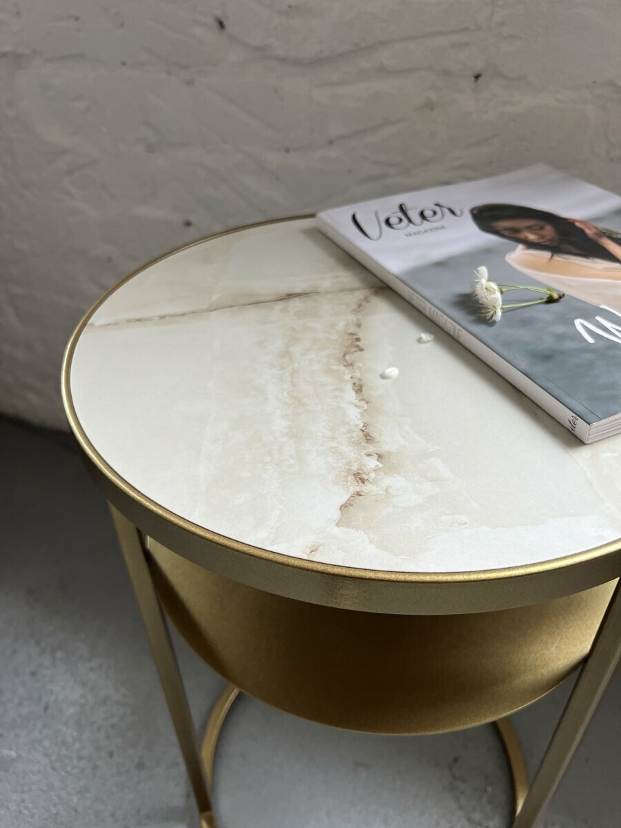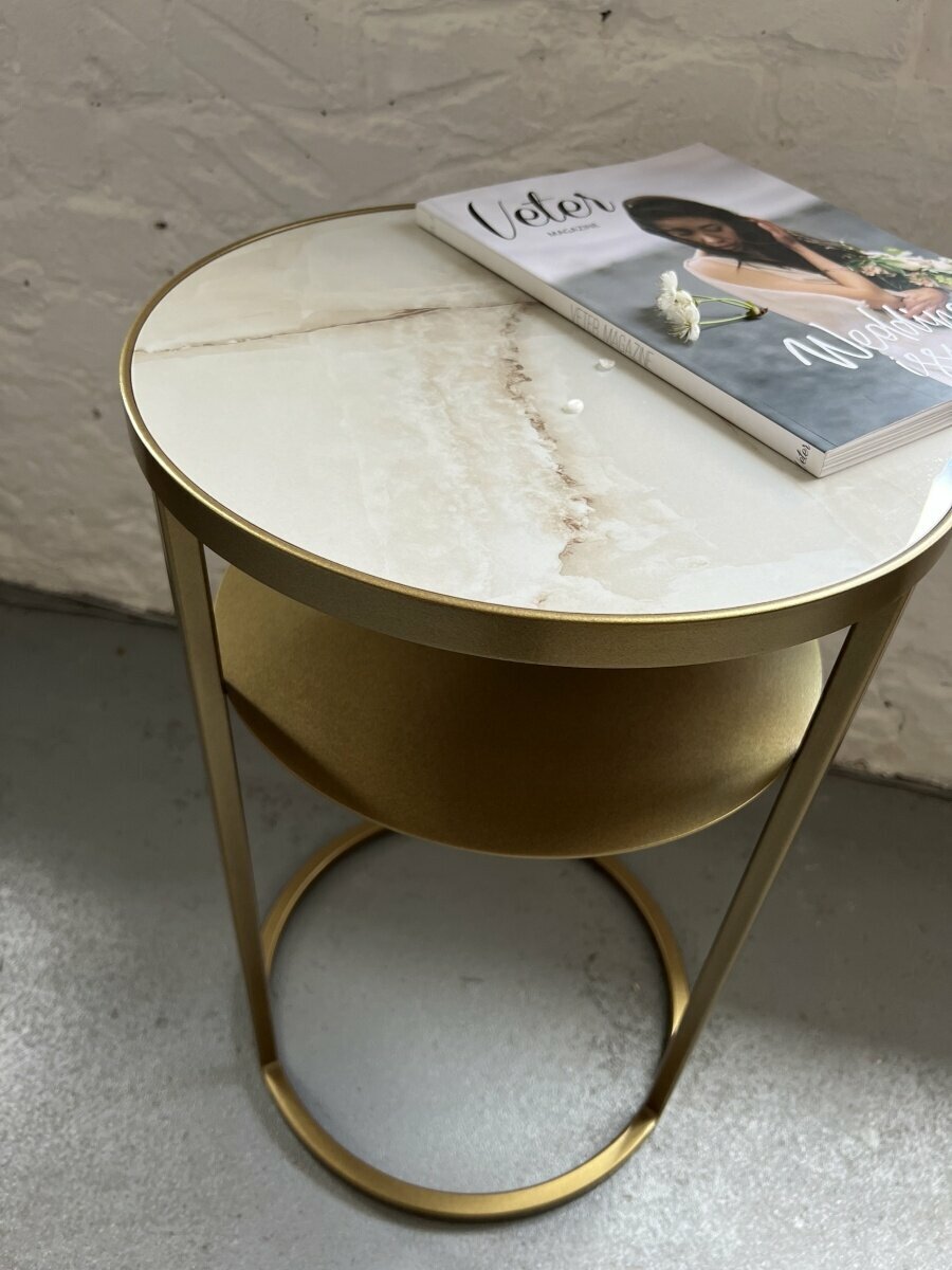 Стол прикроватный журнальный с полкой. Размеры: диаметр 35 см, высота 55 см. Полка на высоте 40 см. Материал столешницы- Керамогранит. Материал столешницы комплекта ONIX - керамогранит глянцевый, лёгкая текстура камня оникс. Полка - металл, толщина 2 мм. Столешница вставлена внутрь профиля. Основание: металлический профиль, сечение 15/15. Цвет основания: бронза матовое. Керамогранит - красивый и прочный материал, имитирующий фактуру мрамора. Устойчив к царапинам, пятнам. Рисунок столешницы различается в каждом конкретном изделии ввиду уникальности и неповторимости материала. Рекомендации по уходу: уборка влажной тряпочкой без использования агрессивных моющих средств.