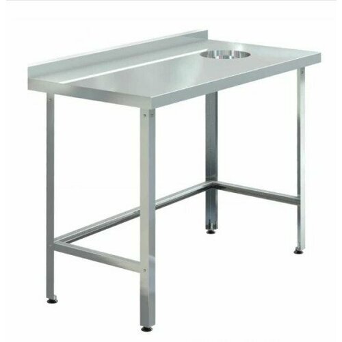 Стол производственный для сбора отходов, сборно-разборный открытый пристенный, серии Standart, с бортом высотой 45мм, отверстием для сбора отходов D220мм по центру, столешницей из пищевой шлифованной нержавеющей стали AISI430 толщиной 1мм оснащён подложкой из ламинированного ДСП толщиной 16мм, рамкой столешницы из оцинкованной стали толщиной 1,5мм, Z-образными креплениями столешницы из нержавеющей стали толщиной 0,7мм, обвязкой с 3-х сторон из оцинкованной стали толщиной 0,7мм, разборным каркасом из оцинкованного гнутого углового профиля 40х40мм толщиной 1,5мм, регулируемыми по высоте пластиковыми опорами ножек. Максимальная равномерно распределенная нагрузка на столешницу - до 150кг. Ножки отгружаются отдельно. Этот стол обладает всеми качествами, необходимыми для использования в производственных целях и на кухне. Изготовлен из прочной и долговечной нержавеющей стали, он обеспечит надежную поддержку для вашей работы. Металлическая конструкция этого стола, усиленная ДСП, придает ему дополнительную прочность и устойчивость. Сочетание нержавеющей стали и металла создает идеальное оборудование для производственных нужд.