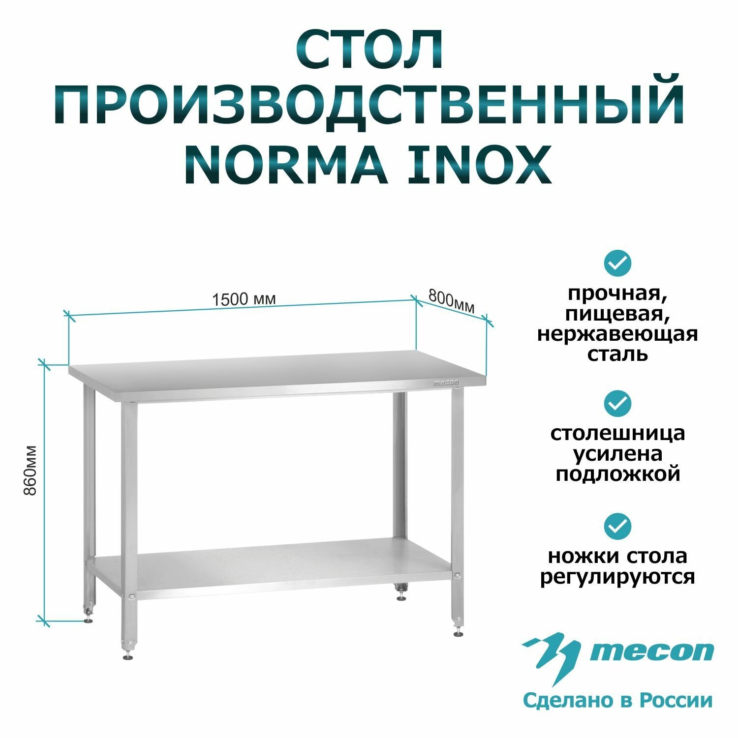 Столы производственные являются обязательным атрибутом как на предприятиях общественного питания, так и на комбинатах, в супермаркетах, кондитерских цехах. Они предназначаются для выполнения всех операций по приготовлению пищи: на столешнице режут продукты, на ней хранят мелкую кухонную технику, которая не занимает много места и всегда должна быть под рукой. Также на нее часто устанавливают различное тепловое оборудование. • столешница цельногнутая из шлифованной пищевой нержавеющей стали марки AISI 430 толщиной 0,8 мм, в защитной пленке; • усиление – подложка из ЛДСП 16 мм; • каркас – разборный, болтовое крепление; • материал изготовления каркаса – нержавеющая сталь, 1,5 мм; • ножки – гнутый угловой профиль с дополнительными подгибами и базирующими пуклевками; • стальные подпятники и регулируемые полиамидные опоры ножек; • нижняя сплошная полка с усилением; • материал изготовления полки – нержавеющая сталь, 0,8 мм; • система фиксации деталей каркаса при сборке.