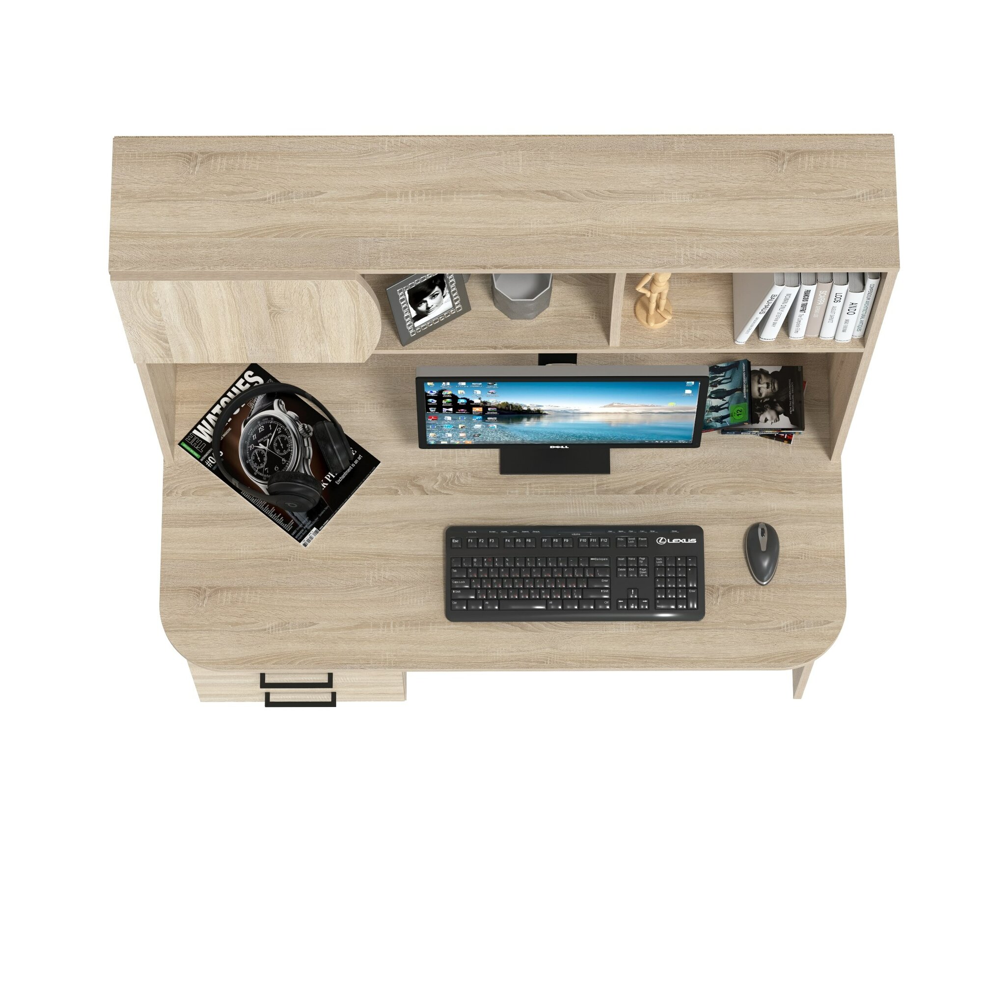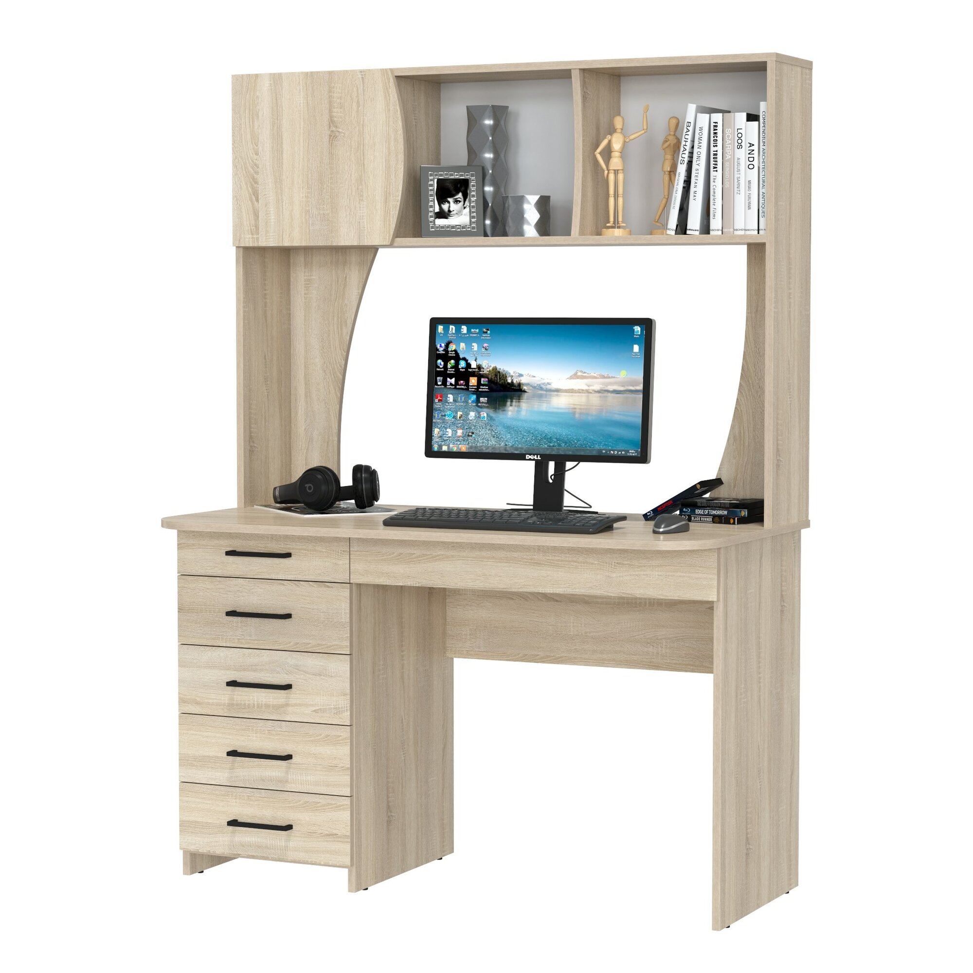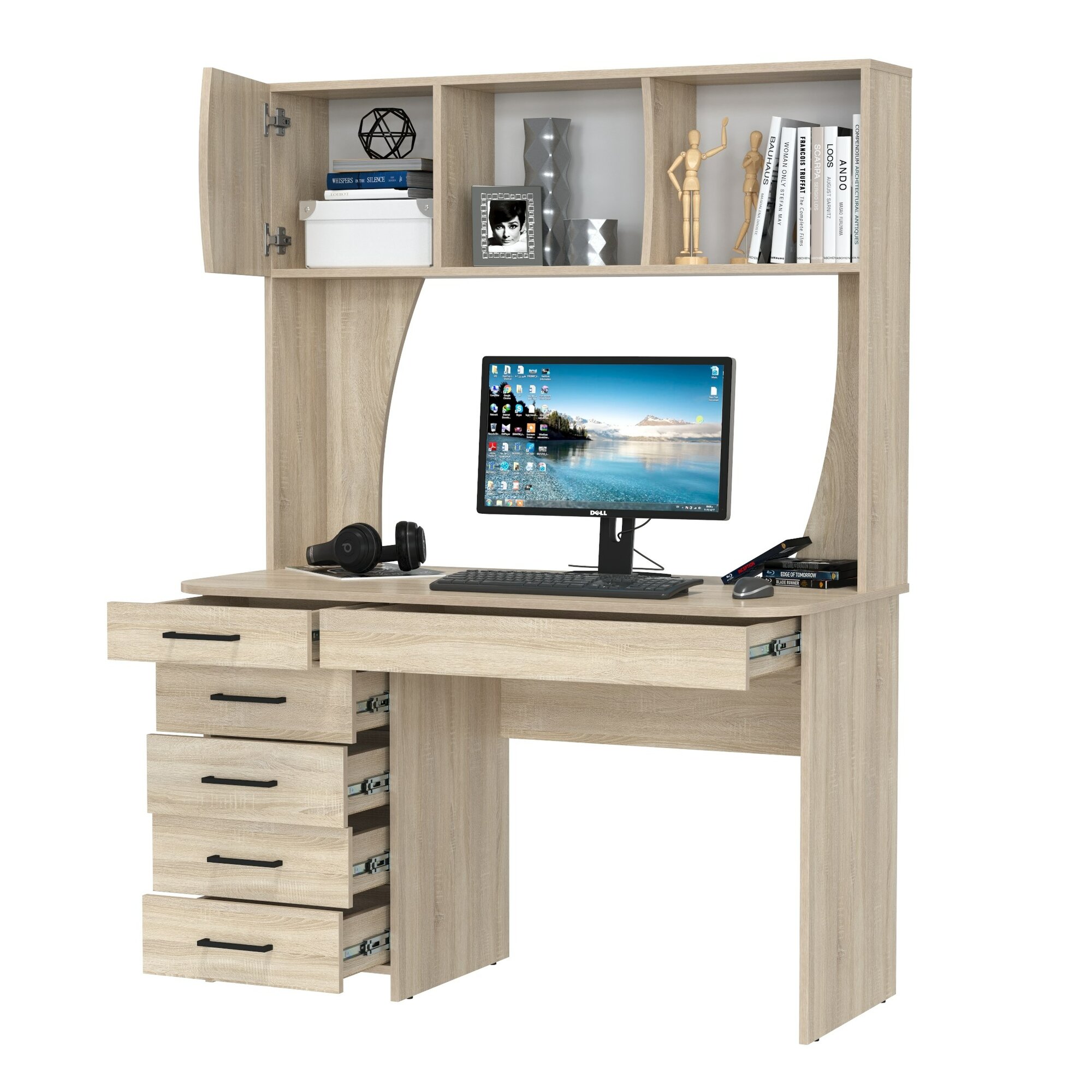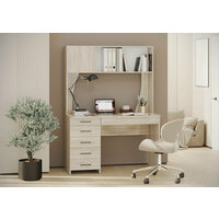 столешница 121х65 см; на ней установлена надстройка с двумя открытыми нишами и одной нишей за распашной дверцей; сборка универсальная не предусмотрена - под столешницей выдвижной ящик справа и тумба с пятью ящичками слева; поставляется в разобранном виде в надёжной упаковке, фурнитура и инструкция по сборке прилагаются