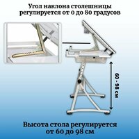Угол наклона столешницы регулируется от 0 до 80 градусов.