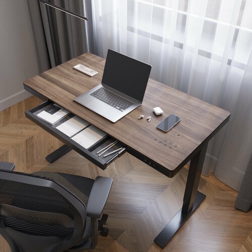 Главные преимущества: 1. Плавная регулировка высоты с двухмоторным основанием — идеально для работы сидя и стоя, снижает нагрузку на позвоночник и улучшает осанку. 2. Встроенная беспроводная зарядка, а также порты USB и Type-C — удобство зарядки ваших гаджетов без лишних проводов. 3. Столешница из МДФ с меламиновой пленкой — устойчива к загрязнениям, 1. проста в уходе и долговечна. 4. Выдвижной ящик — функциональное хранение для канцелярии и важных мелочей. 5. Тихая и надёжная работа моторов — бесшумное изменение высоты без лишних звуков.