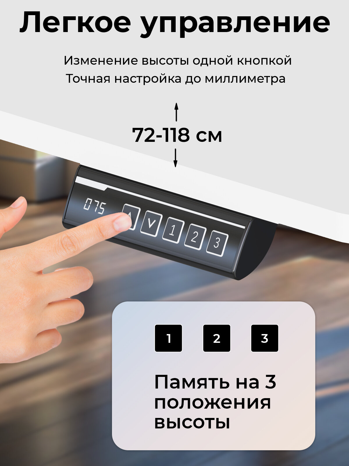 - Память на 3 положения: Сохраните до трех любимых высот в памяти и переключайтесь между ними мгновенно. Настройка рабочего места под себя никогда не была такой простой!