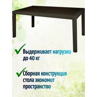 Пластиковая мебель интерьерное решение жилых помещений- украшение террасы, веранды и дачи. Самое популярное плетение воплощено в различных размерах и формах. Стол для дачи выдерживает нагрузки до 40 кг при равномерном распределении на изделие. Оснащен дополнительными вставками в конструкцию для большей прочности. Стол собирается с помощью пластикового ключа и гаек, входящих в комплект. Габариты пластикового стола дают возможность универсального сезонного использования на даче, в открытом пространстве или на балконе при температуре до -5С. Сборная конструкция стола экономит пространство, позволяя использовать по мере необходимости.