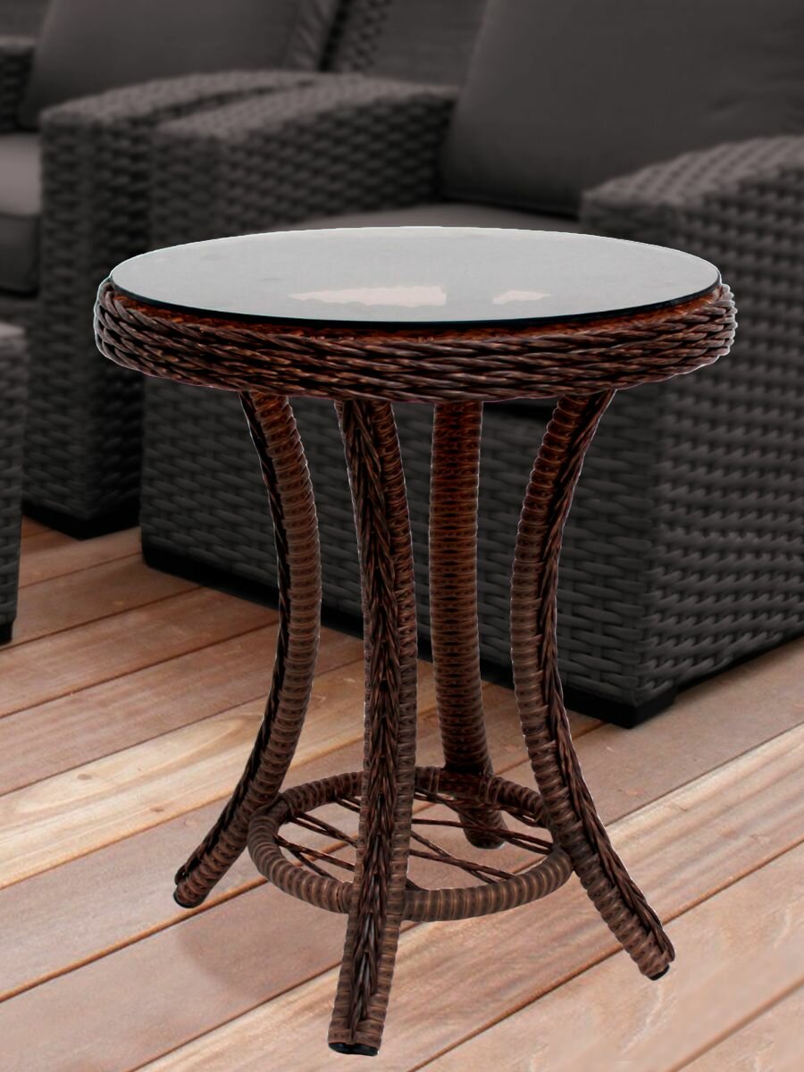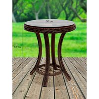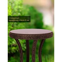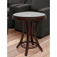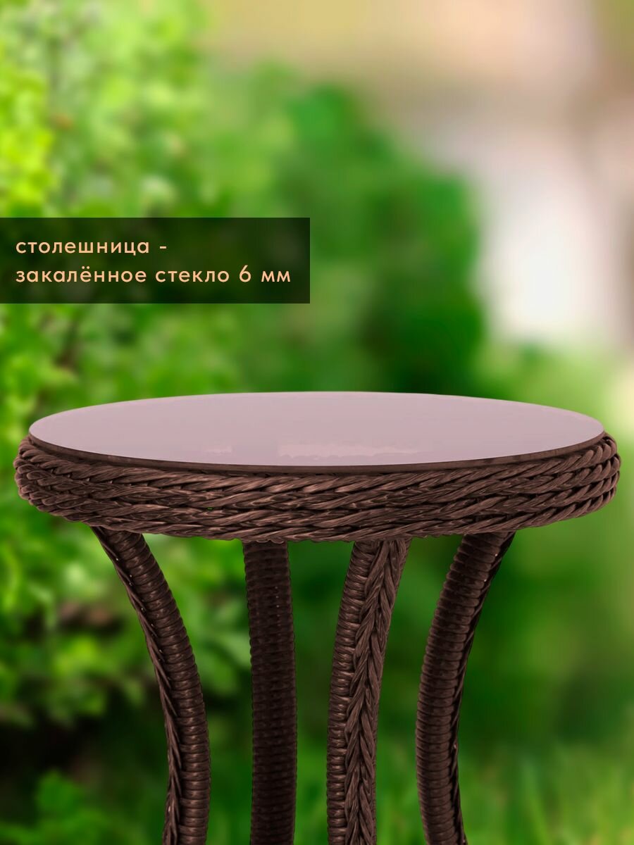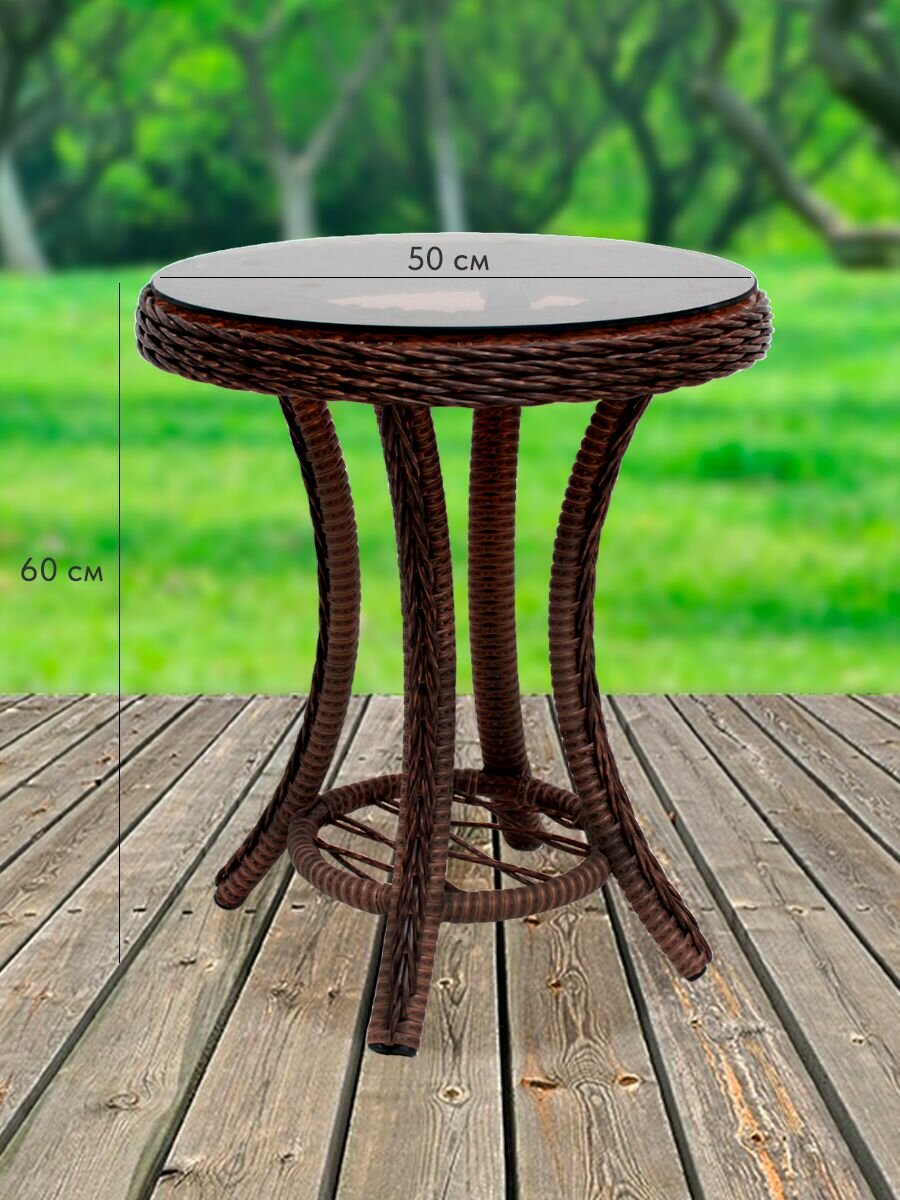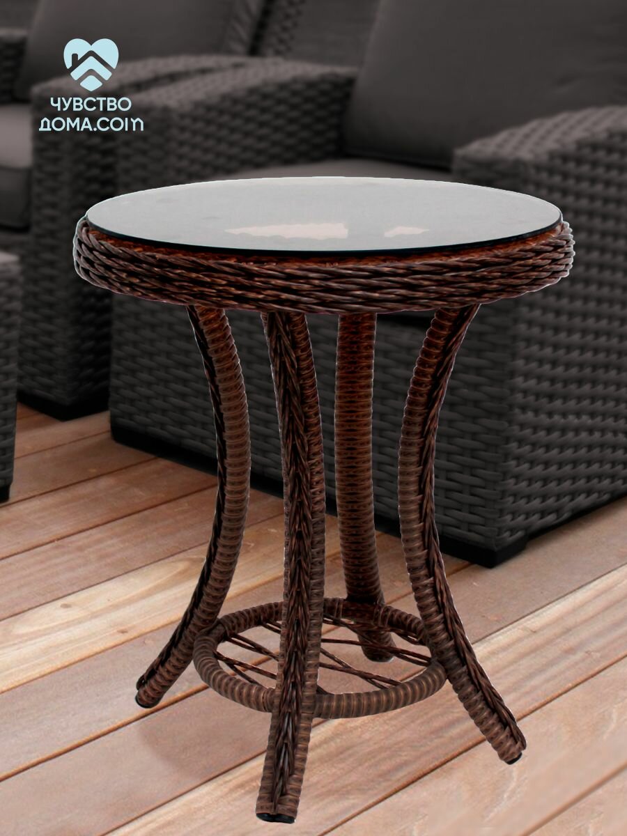 Стол Ария изготовлен вручную из искусственного ротанга. Защищен от выцветания при попадании УФ-лучей, пыли, электризации и ржавчины. Легко очищается. Подходит как для внутреннего, так и для наружного применения. D 50 см.