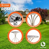 Изящная форма и изысканный дизайн компактного столика ROMEO не только выгодно выделяют его в интерьере, но и помогут создать гармоничное пространство на загородной веранде, городском балконе или приусадебном участке. Столешница, декорированная оригинальным винтажным орнаментом из мозаики, и прочный каркас, изготовленный из стального сплава с напылением краски, выглядят дорого, элегантно, добавят ноты изысканности и индивидуальности в ваш интерьер. Небольшие потертости и признаки старины подчеркивают неповторимый облик изделия. Удобные размеры и простота конструкции позволяют использовать столик ROMEO, как по прямому назначению, так и в качестве дополнительной сервировочной поверхности. Модель практична, надежна, устойчива к воздействию влаги, температурным перепадам и проста в уходе. Поставляется в разобранном виде.