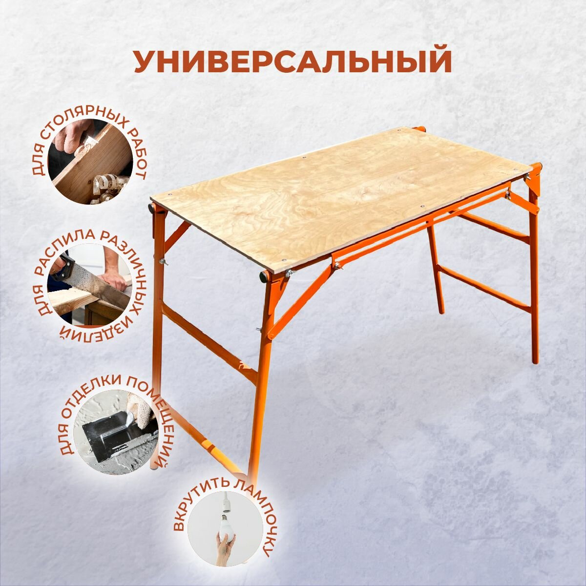 Малярный столик складной Промышленник H80 представляет собой простую и функциональную конструкцию, используемую для проведения малярных и ремонтных работ. Его не нужно собирать как аналогичные модели. Для начала работы требуется только разложить ножки. Они затягиваются специальными гайками (идут в комплекте) для большей устойчивости в процессе работы. Рабочая площадка столика изготовлена из шлифованной фанеры толщиной 9.5 мм и уже прикручена к его корпусу. Столик имеет лестничный подъем с обеих сторон, что добавляет удобства при его эксплуатации. Высота модели - 80 сантиметров. Благодаря этому на нем можно проводить малярные и штукатурные работы стен и потолков на высоте до 2,7 метров.