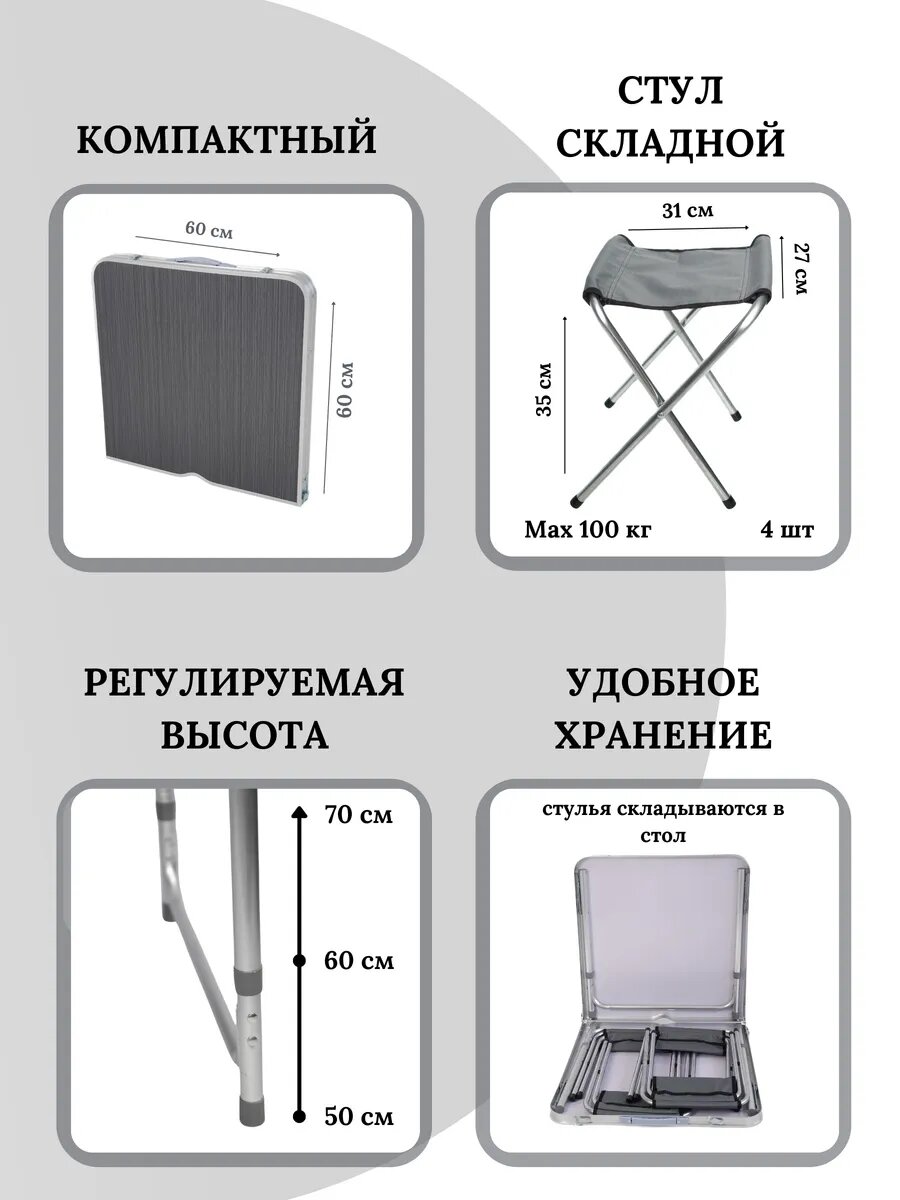 Набор мебели для дачи, сада, похода или кемпинга Аквафишка включает стол с прямоугольной столешницей из МДФ и металлическими ножками, регулируемыми по высоте, 4 стула с основанием из текстиля. Для выездов в лес, на природу, на пляж семьей или большой компанией непременно пригодится стол туристический складной с четырьмя стульями. Каркас раскладного туристического стола оснащен крепежом для регулировки высоты (3 положения: 50/60/70 см) и отверстием для зонта. Комплект мебели для похода, рыбалки, охоты складывается до размеров кейса и имеет широкую пластиковую ручку для комфортной переноски. Ламинированная столешница размером 120х60 см складывается пополам, внутрь убираются стулья и весь набор мебели туристической превращается в чемодан размером 60х60х7см. Прочный стол книжка и удобные тканевые стулья легко помещаются в багажник автомобиля, его можно брать на короткие расстояния и в дальние путешествия. Стол раскладной и табуретки с мягким сидением - практичный выбор для дачников, охотников, рыбаков и туристов. Стол раздвижной отличный подарок мужчине, рыбаку, охотнику, папе, мужу на Новый год, НГ, 23 февраля, День Защитника Отечества. Походное кресло выдерживает вес до 100 кг, стол до 30 кг. Размер стула: 35х31х27 см.