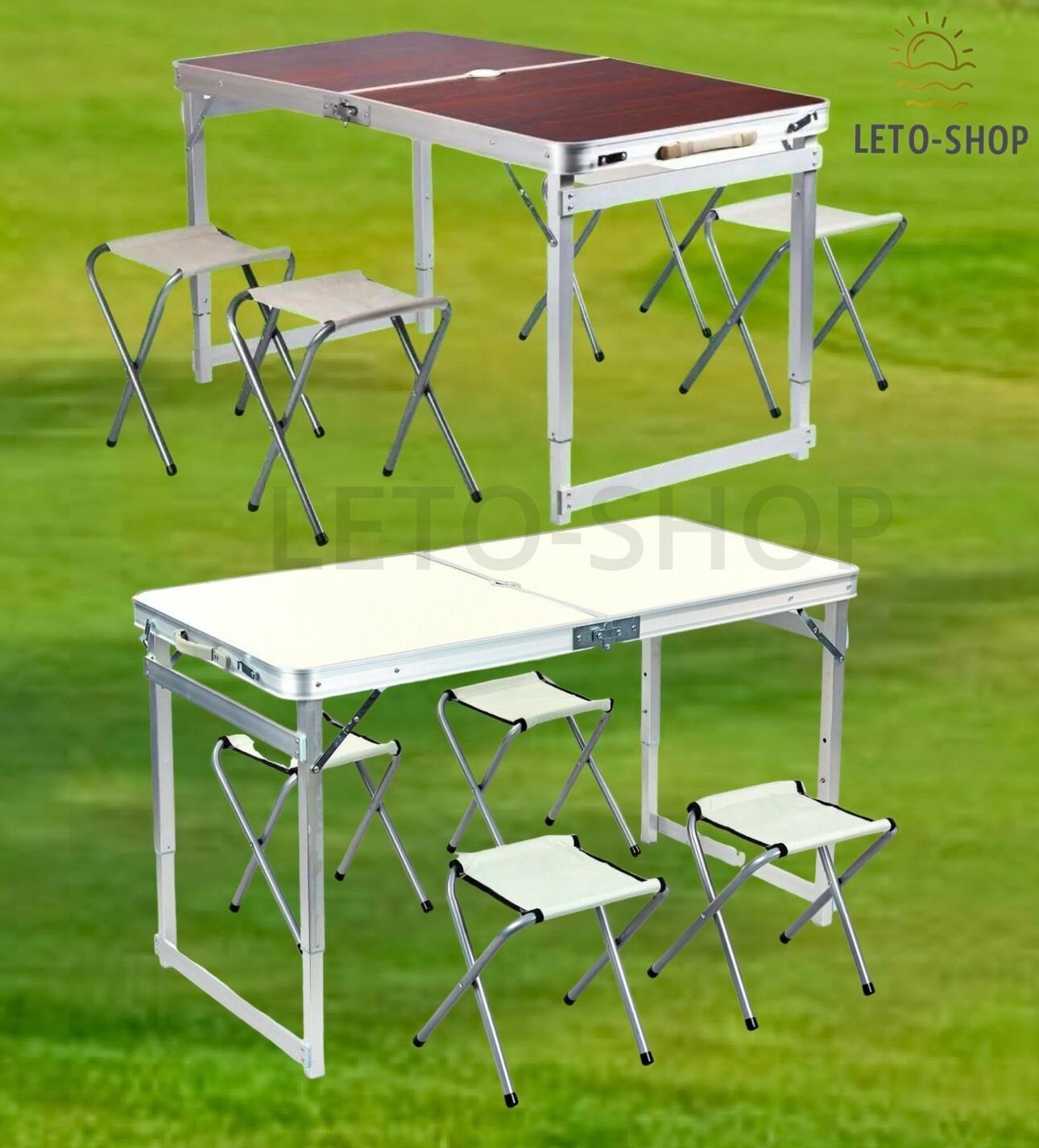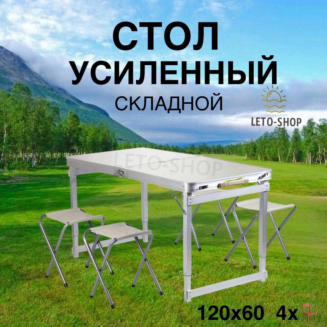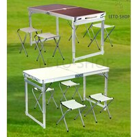 Комплект складной мебели для семейного отдыха на природе, состоящий из стола и 4-х стульев, который не займет много места в машине, металл сверхусиленный, столешница 5-ти слойная. Высоту ножек стола можно отрегулировать , имеют три положения высоты стола. В собранном виде набор не занимает много места, 4 стула компактно складываются в стол, столешница складывается пополам в плоский чемоданчик с ручкой для переноски. Покрытие походного стола - водостойкое, устойчивое к пятнам и легко очищающееся.