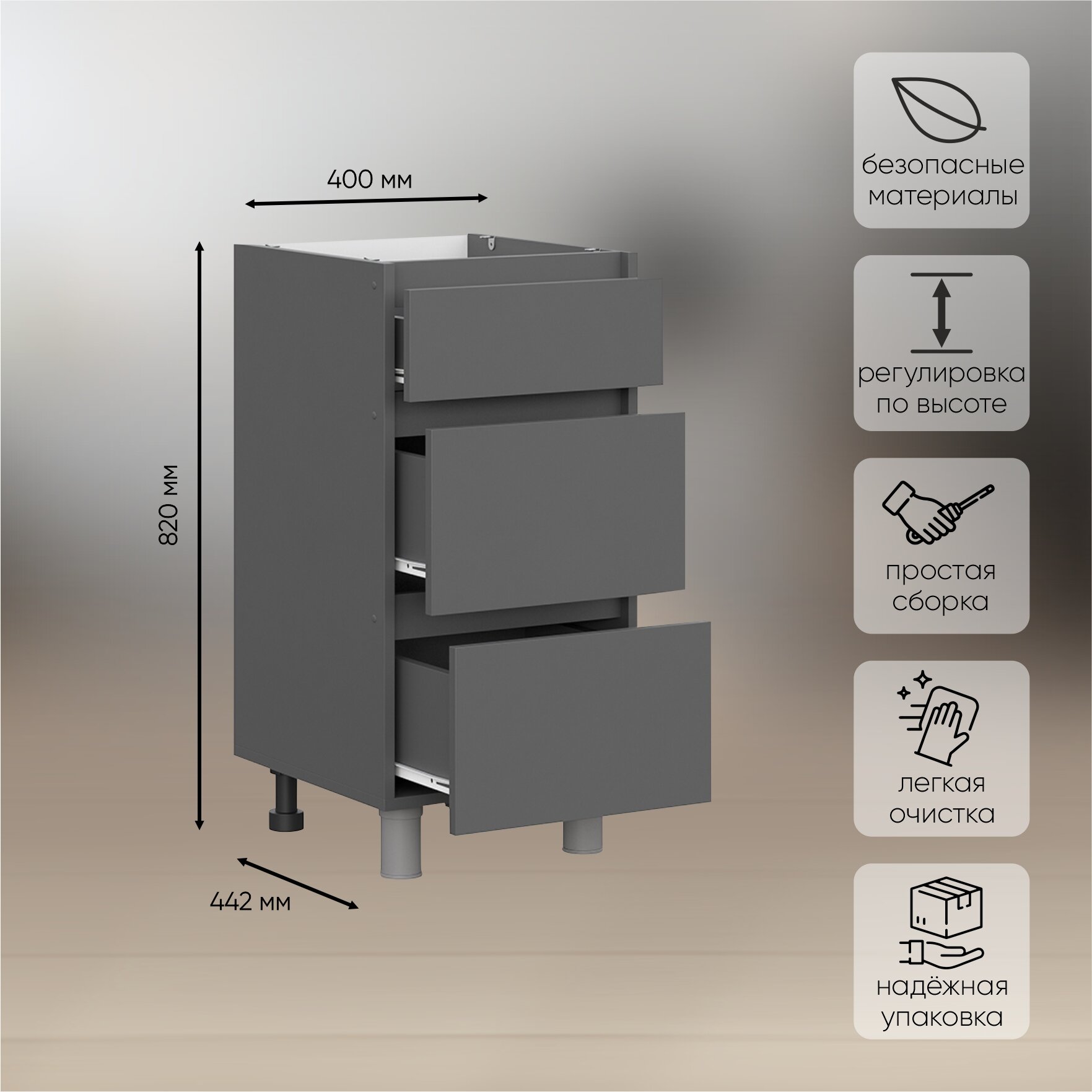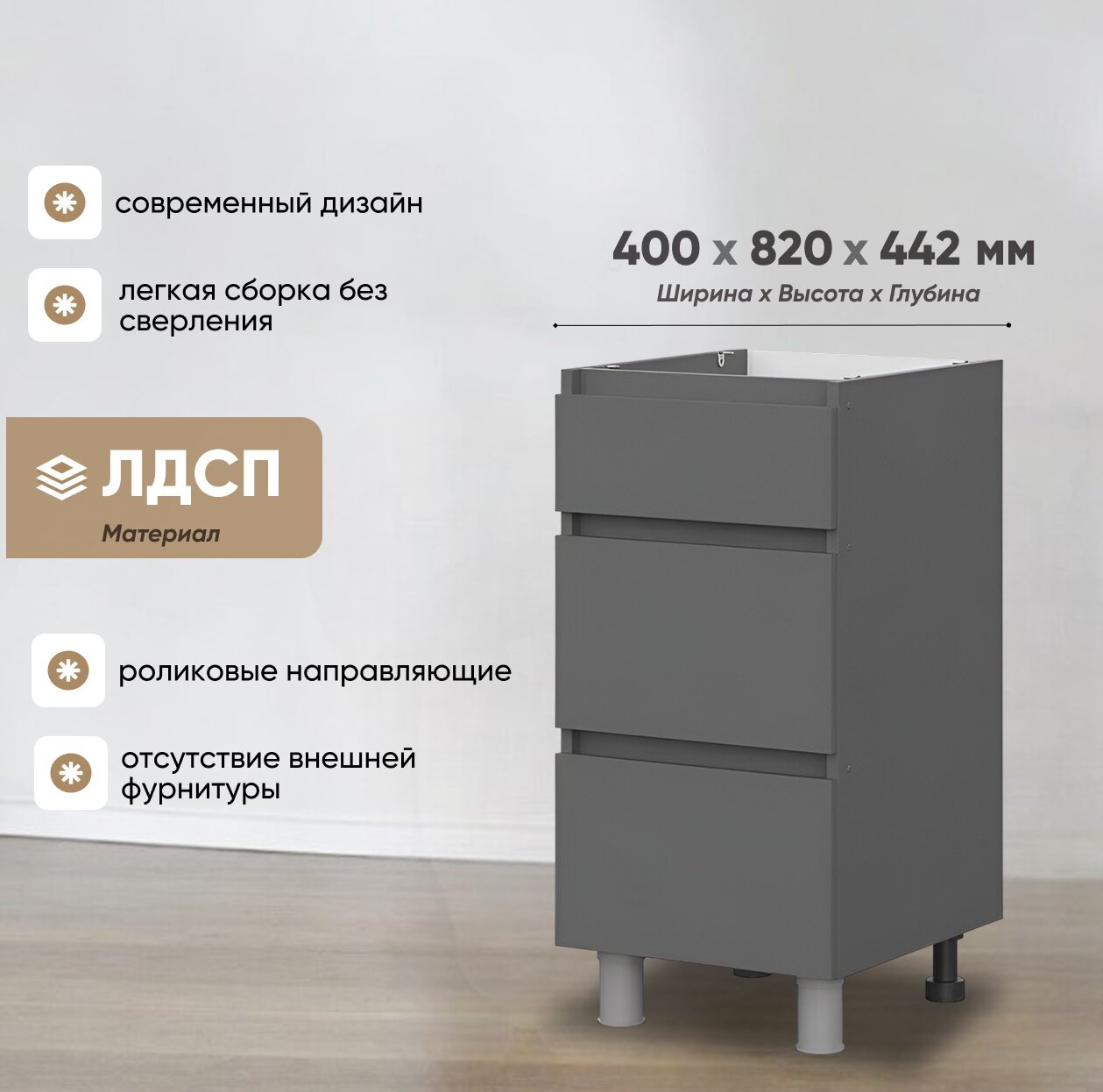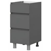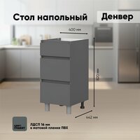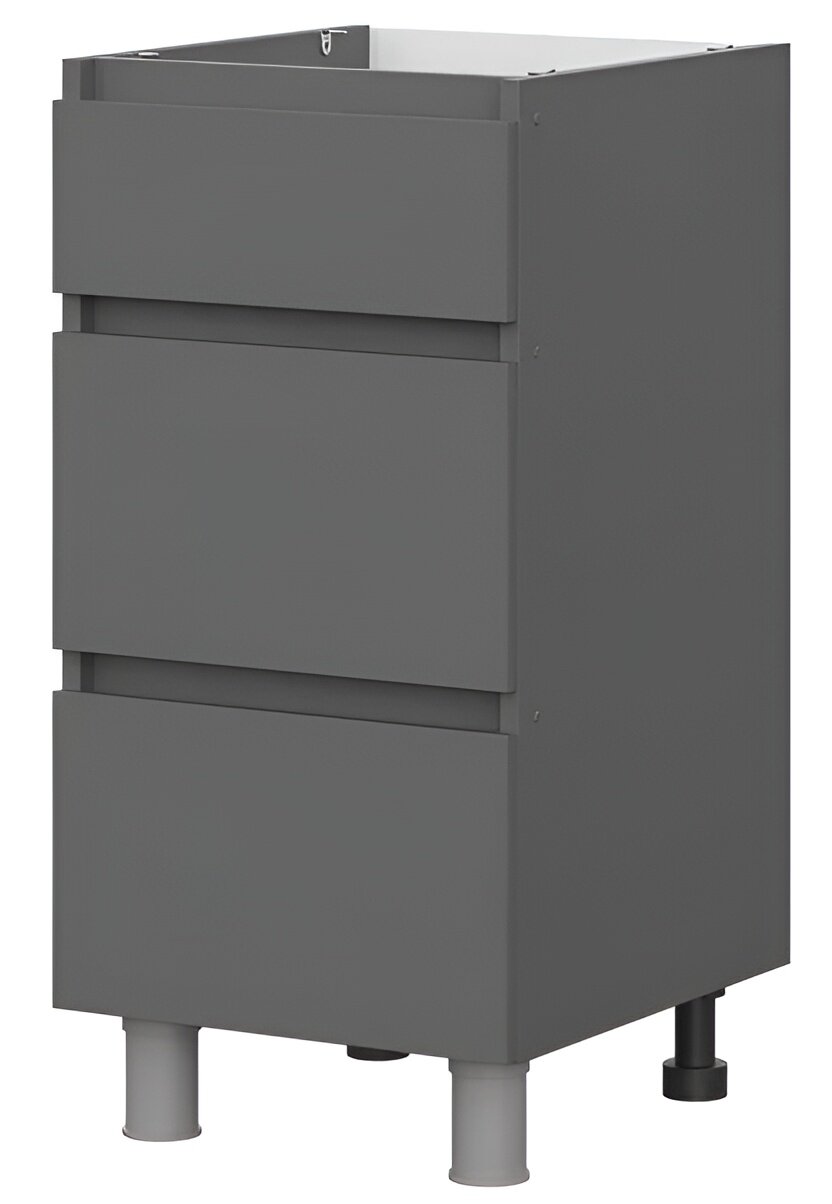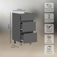 Нижняя тумба шириной 400 мм с тремя выкатными ящиками из модульной серии Денвер. Матовый фасад и отсутствие внешней фурнитуры привлечет внимание гостей и украсит кухню. Конструкция предусматривает максимальную нагрузку до 3 кг. Изделие отличается долговечностью и экологичностью, так как производится на современных станках с использованием качественных материалов и профессиональных сотрудников.