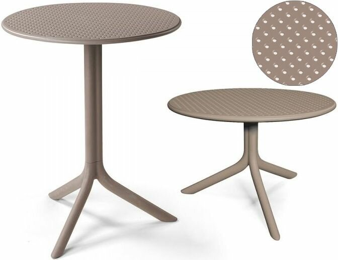 Инновационный стол Step – это модель, которая может превращаться из обеденного стола в журнальный путем смены опоры. Круглая столешница оснащена небольшими декоративными и функциональными отверстиями, которые обеспечивают очень хороший дренаж. Большая цветовая палитра отделок состоит из ярких и теплых оттенков, что позволяет подобрать максимально нужный вариант в соответствии с потребностями.