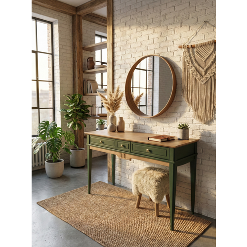 Туалетный столик «Пенни» изготовлен из массива натуральной сосны. Он станет функциональным и эстетичным элементом интерьера спальни, а также может использоваться в гостиной в качестве консоли. Габаритные размеры стола: ширина — 1200 мм, глубина — 450 мм, высота — 800 мм. Покрытие: матовый лак на водной основе с добавлением пчелиного воска ведущего производителя лакокрасочных покрытий в Швеции Becker Acroma. Покрытие безопасно для человека и домашних животных, не имеет запаха и не вызывает аллергических реакций. Столик представлен в сочетании цветов «изумруд + антик». Комбинация цветов подразумевает отделку столешницы в цвет «антик», остальная часть изделия выполнена в глубоком красивом зелёном цвете. Наиболее близкий к зелёному оттенку по системе RAL — 6020. Цвет «антик» подчёркивает и пропускает текстуру натурального дерева. Цвет «изумруд» текстуру дерева практически не пропускает. Выдвижные ящики установлены на шариковых направляющих частичного выдвижения без доводчиков. Ручки — металлические кнопки. Дно ящиков выполнено из ламинированного оргалита белого цвета. Внутренняя часть ящиков и боковины изготовлены из массива сосны и покрыты лаком в цвет корпуса изделия. Туалетный столик поставляется в разобранном виде. В комплект входят вся необходимая фурнитура и инструкция по сборке изделия.