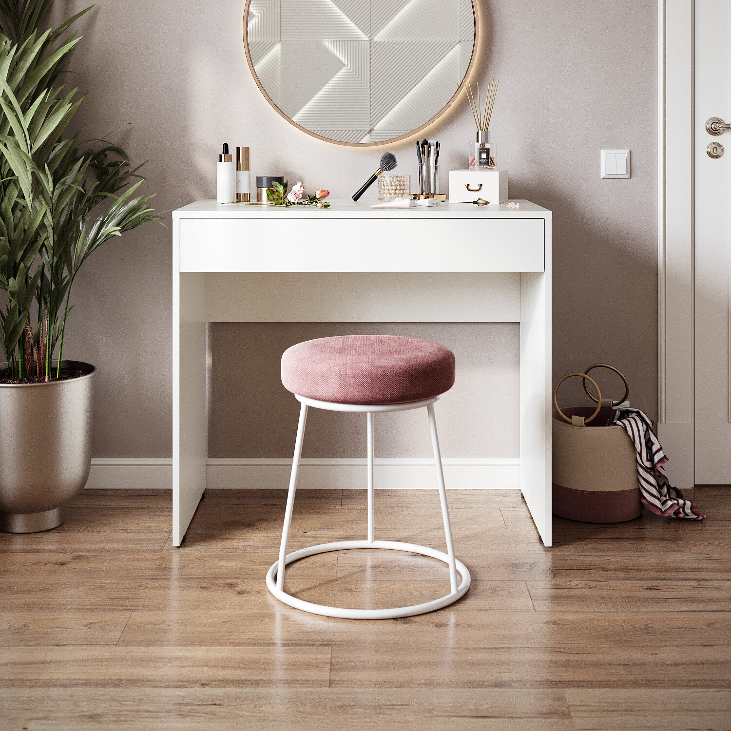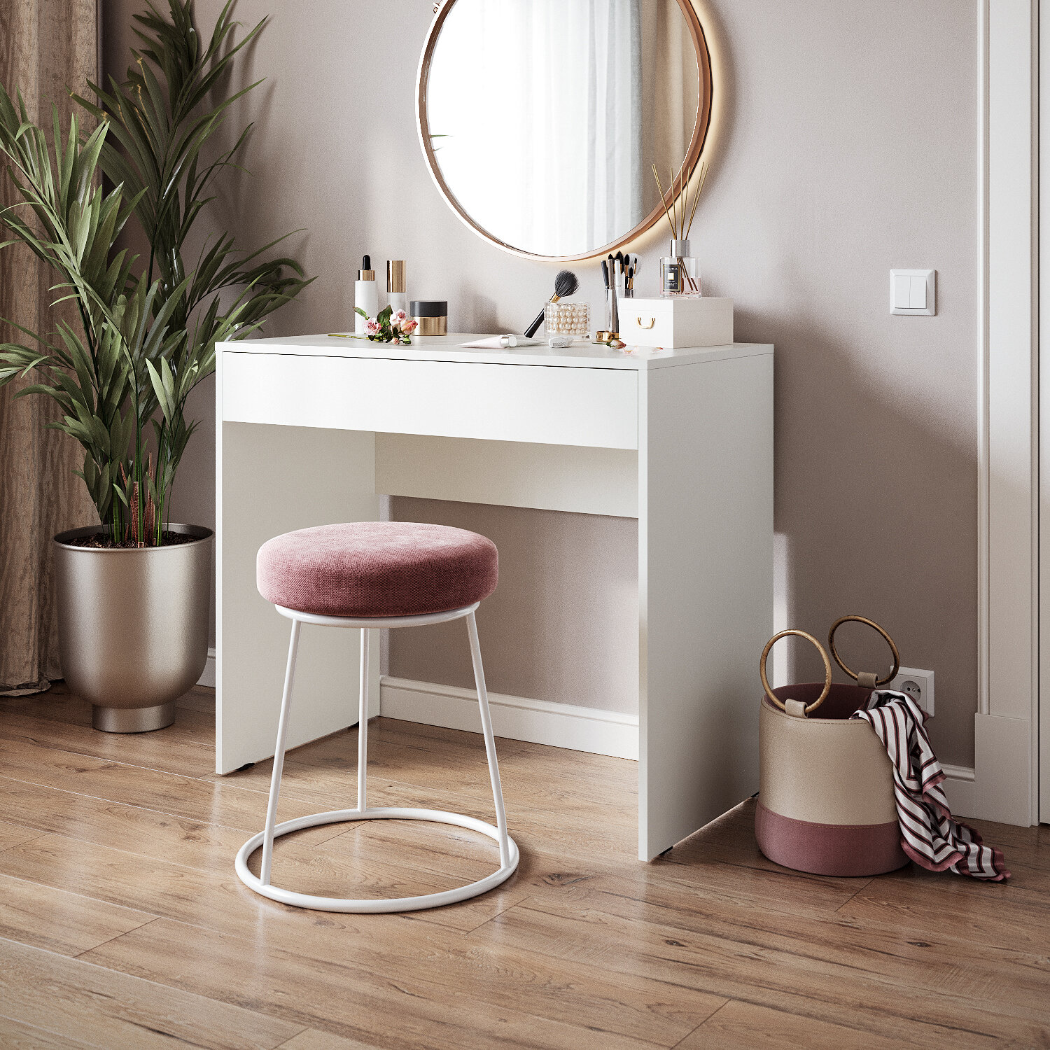 Благодаря удобной рабочей поверхности столик можно использовать как место для нанесения макияжа, ежедневного ухода, укладки волос. Он быстро превращается в комфортную beauty-зону.