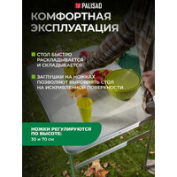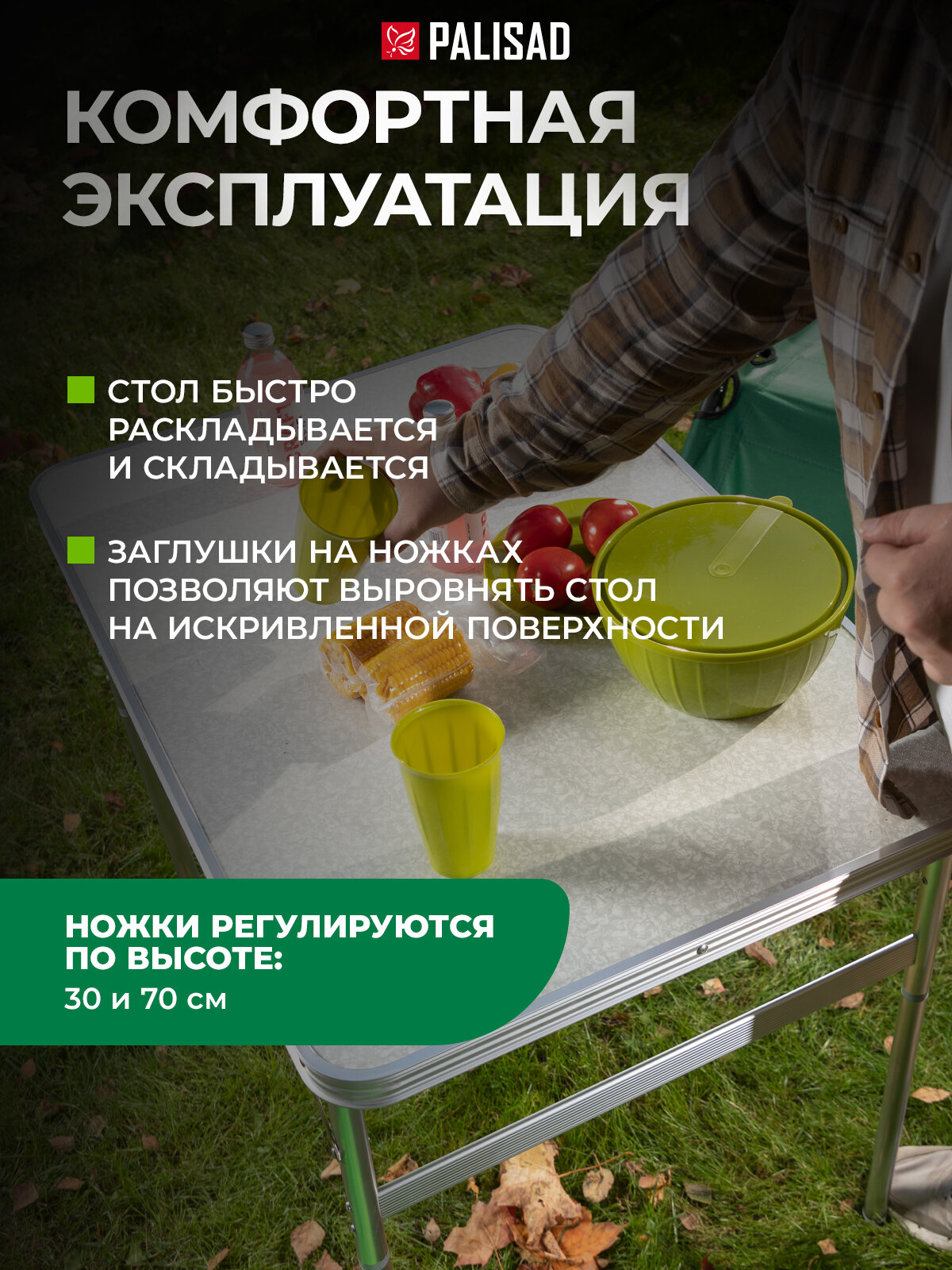 Складной стол Palisad Camping 69583 размером 900 х 600 х 300 / 700 мм, с алюминиевыми ножками и столешницей из МДФ, позволяет с комфортом разместиться компании из нескольких человек. Надежная столешница из МДФ легко выдерживает вес приборов и блюд с пищей. Высота ножек регулируется и может составлять 30 или 70 см. Ножки изготовлены из алюминиевого сплава, что облегчает конструкцию. Стол весит 4,22 кг, поэтому его легко перемещать. Он будет полезен для организации отдыха на природе, а также пригодится во время приема гостей в доме.