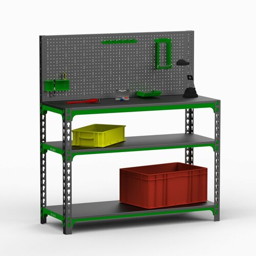 Предназначен для удобной организации отдельного рабочего места на производствах, складах, гаражах, мастерских и на других объектах. Максимум распределённой нагрузки на весь верстак составляет - до 360 кг. Максимум распределённой нагрузки на полку составляет - до 150 кг. Крепление стола: Безболтовое. Цвет : тёмно-серый +зелёный.