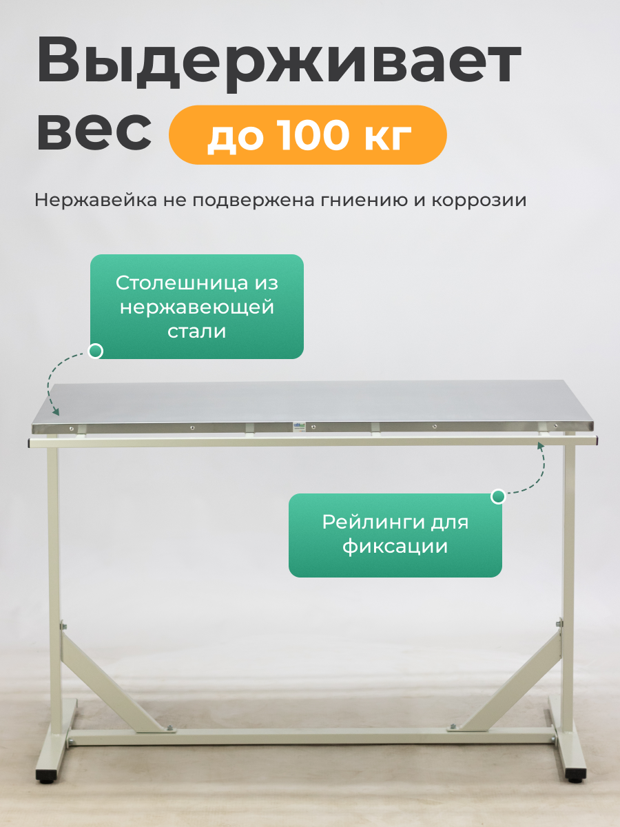 Нержавейка не подвержена гниению и коррозии, также стоит отметить, что благодаря высокой химической стойкости материала столешницу можно обрабатывать любыми видами дезинфицирующих средств. По бокам столешницы имеются рейлинги для фиксации конечностей животных с помощью веревок во время оперативных вмешательств.