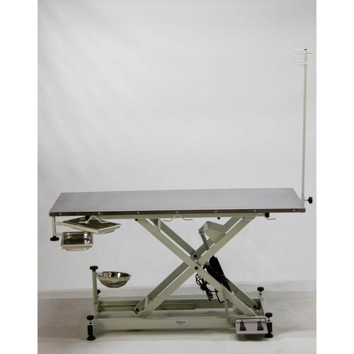 Стол ветеринарный СВ-11 с усиленной конструкцией ножек, столешницей из нержавеющей стали и регулировкой высоты от 40 см до 100 см выполнен из качественной нержавейки и может использоваться для хирургических операций, перевязочных и других лечебно-профилактических работ. Управление электроприводом осуществляется с ножного пульта. Данный стол может использоваться для животных весом до 150 кг! Не шатается даже под неспокойным пациентом. Нержавейка не подвержена гниению и коррозии, также стоит отметить, что благодаря высокой химической стойкости материала столешницу можно обрабатывать любыми видами дезинфицирующих средств. Данный стол может использоваться в ветеринарных клиниках и стационарах, а также в груминг и зоосалонах.
