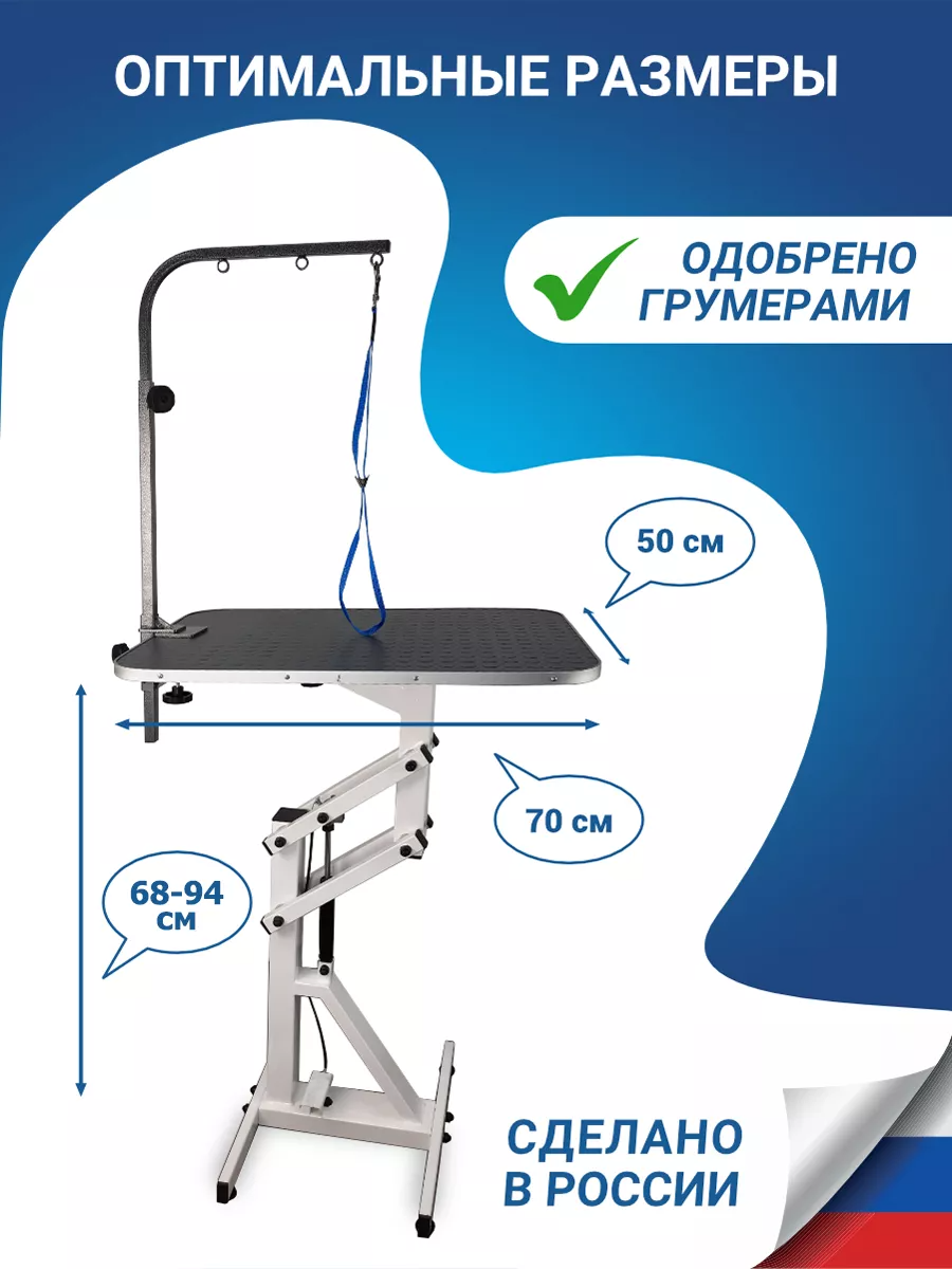 Стол для груминга wikiGROOM c размером столешницы 70 х 50 см и регулировкой высоты подъема столешницы от 68 до 94 см на пневмоподъемнике позволяет стричь мелкие и средние породы собак, Стол также является универсальным - подходит для грумеров любого роста. Ножки выполнены из толстого металла с использованием качественной фурнитуры, поэтому конструкция прочная и не шатается даже под неспокойным клиентом. Материал столешницы ЛДСП, стойкий к воздействию влаги и грязи. Покрытие стола - это особая гордость компании, прочный и не скользящий материал, который делается на заказ и по индивидуальным характеристикам необходимым для работы с животными.
