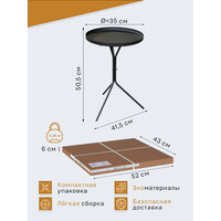 Мобильность столика обеспечивается благодаря трем ножкам, изготовленным из металла. Это позволяет легко поднять и перенести столик в любое место, а бортик по краю столешницы предотвращает падение бокалов и тарелок во время использования.