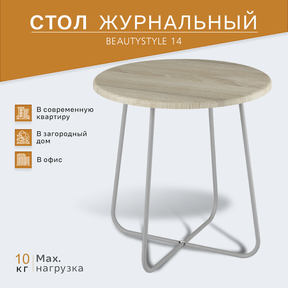 Журнальный столик BeautyStyle 14 универсален. Он подойдёт для дома, дачи, квартиры, офиса. На его поверхности все важные вещи во время отдыха будут под рукой. Также стол можно использовать как чайный, кофейный, сервировочный. Дизайн стола прост и сдержан, как и представленные для модели цветовые решения. Столешница стола деревянная, а его каркас – металлический. Столик малогабаритный и лёгкий, поэтому его удобно перемещать.
