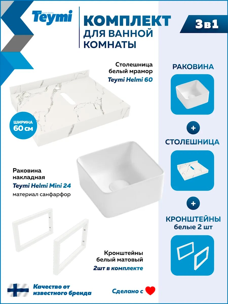 Купить Столешница керамогранитная 60 см белый мрамор с раковиной Teymi Helmi Mini 24 кронштейны 2 шт. белые в комплекте F13948 с доставкой по всей России.