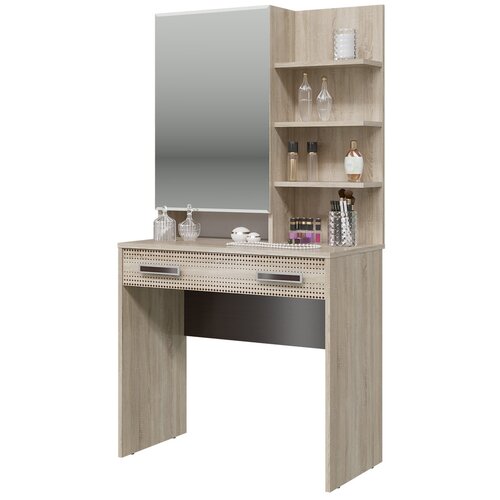 Трюмо Румба - элегантный туалетный столик, мечта каждой женщины, станет роскошным украшением вашей спальни. Удобное трюмо представляет собой столик с выдвижным ящиком и надстройкой с полками и сдвижным зеркалом. Слева, за зеркалом, оборудована вместительная ниша с двумя полками, справа - три открытые полочки. Универсальная сборка НЕ предусмотрена. Конструкция, позволяет хранить все необходимые дамские штучки в одном месте, существенно экономя время сборов. Края зеркала трюмо обработаны фацетом - для красоты и травмобезопасности. Румба Трюмо - элемент из серии мебели спальни Румба. В производстве использовались только высококачественные материалы и фурнитуры. Серия мебели для спальни Румба выполнена из ламинированной ДСП 16 мм, класса эмиссии Е1, торцы - ПВХ-кромка. Ящики закреплены на металлических телескопических направляющих, обеспечивающих надёжный прямолинейный ход. Пластиковые подпятники мебели защитят покрытие пола от механических повреждений. Мебель поставляется в разобранном виде, с комплектом фурнитуры и инструкцией по сборке. Размер трюмо (ШхГхВ): 80х43х153 см. Производитель - Российская фабрика Гранд Кволити.