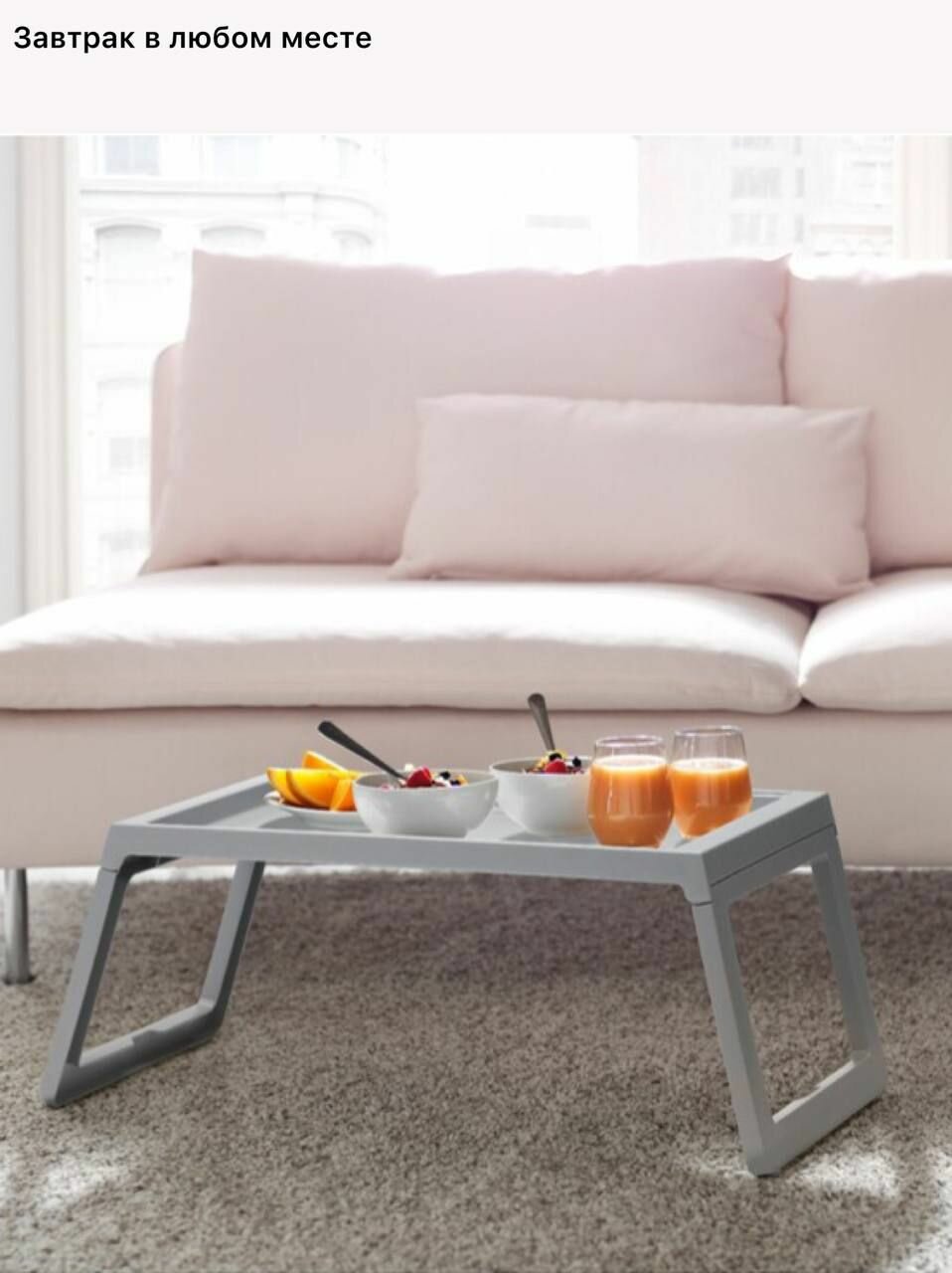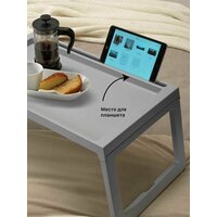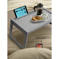 Удобный столик на фиксирующихся ножках икеа Клипск устойчиво стоит на кровати.