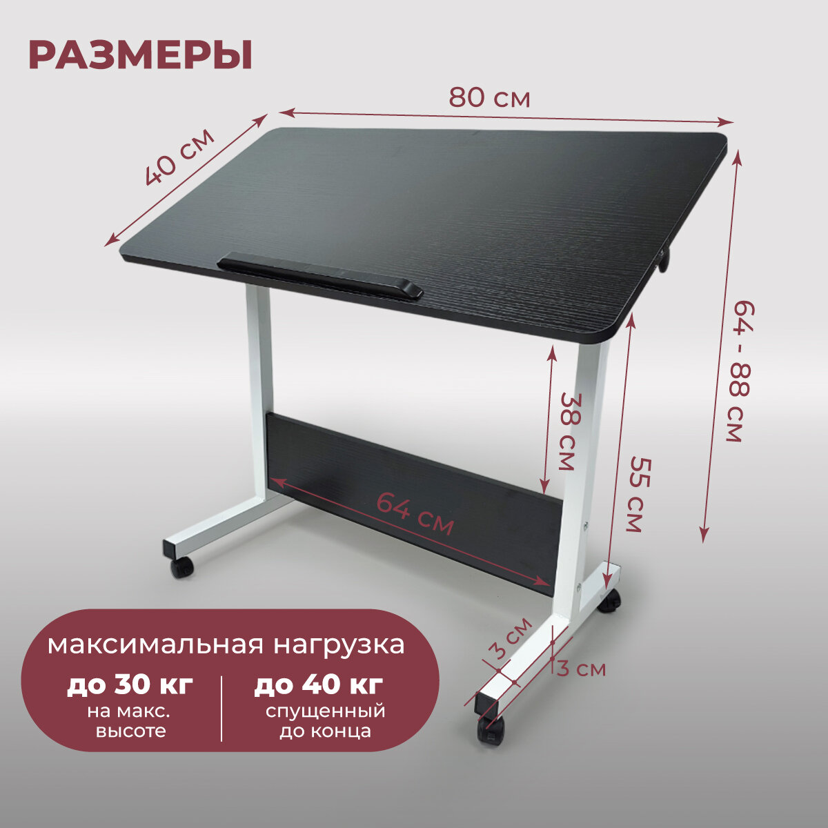 Складной столик для ноутбука значительно повысит уровень комфорта работы и предотвратит перегрев компьютера или планшета. Модель предназначена для работы с ноутбуками и планшетами с диагональю экрана от 7 до 17 дюймов. В нижней и части столешницы установлен ограничитель, предотвращающий скатывания ноутбука с рабочей поверхности при значительном угле её наклона. Подставку для компьютера удобно устанавливать у дивана, кресла или кровати. Высота регулируется поднятием или опусканием ножек. Нижнее положение позволит использовать его как столик в кровать для завтрака. Так же его можно поставить в гостиной вместо журнального столика. Угол наклона столешницы также можно регулировать, ее можно настроить под свои потребности и применять как стол игровой для пк. Не нужно больше сидеть в месте, которое не соответствует вашему росту или не имеет возможности регулировки высоты. На поверхности детского или взрослого столика можно разместить дополнительные аксессуары и письменные принадлежности. Компьютерный мини столик имеет портативные размеры, небольшой вес и трансформирующуюся конструкцию. Это позволяет использовать его в любом месте: дома, на работе или на отдыхе. За счет колес, стол легко перемещается и используется как прикроватный столик. По окончанию работы конструкция складывается и с лёгкостью помещается в шкаф, не загромождая пространство комнаты. А еще, в свободное от работы время, на нём можно подавать кофе в постель на кровать. Такой маленький раскладной столик идеально впишется в комнату подростка или школьника. Приставной кроватный столик - полезный подарок на день рождения или новоселье сестре, коллеге или учителю. Преподнесите презент маме, любимой подруге или жене, чтобы выразить вашу любовь. Такой аксессуар будет приятно получить в подарок сыну, папе и мужу, парню и брату. Особенно актуально это будет тем, кто работает удалённо и дистанционно.