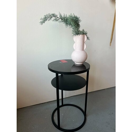 Столик оснащен одной полкой, что позволяет разместить на нем различные предметы декора или книги. Металлический каркас обеспечивает надежность и устойчивость конструкции.