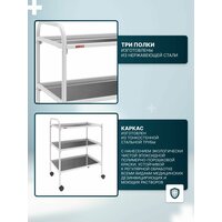 Универсальная тележка - столик процедурная медицинская МСК-502М с тремя металлическими полками с Регистрационным Удостоверением и Сертификатом Соответствия. Тележка внутрибольничная предназначена для размещения инструментов, приборов разных назначений, лекарственных препаратов, также для оснащения салонов красоты, тату салонов, стоматологических, смотровых кабинетов больниц и поликлиник. Благодаря колесикам столик легко скользит по любой поверхности и его можно передвинуть куда угодно. Каркас медицинского столика изготовлена из тонкостенной стальной трубы с нанесением экологически чистой эпоксидной полимерно-порошковой краски, устойчивой к регулярной обработке всеми видами медицинских дезинфицирующих и моющих растворов. Колесные опоры: самоориентирующиеся пластиковые, мебельные, не оставляющие следов на полу, два колеса мебельные пластиковые, поворотные - ∅50 мм. - 3 полки – из нержавеющей стали - Выдерживает нагрузку до 10 кг. - Габариты: 640 х420х860 мм. - Высота на колёсах - 860 мм. - Масса не более -11 кг. - Количество полок - 3 шт. - Соответствует требованиям ГОСТ - Гарантийный срок - 12 месяцев - В комплектацию входит инструкция + паспорт изделия. Предприятие-изготовитель гарантирует соответствие продукции требованиям технической документации при соблюдении потребителем условий эксплуатации, транспортирования и хранения, установленных в технической документации и указанных в настоящем паспорте.