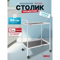 Каркас медицинского столика изготовлена из тонкостенной стальной трубы с нанесением экологически чистой эпоксидной полимерно-порошковой краски, устойчивой к регулярной обработке всеми видами медицинских дезинфицирующих и моющих растворов.