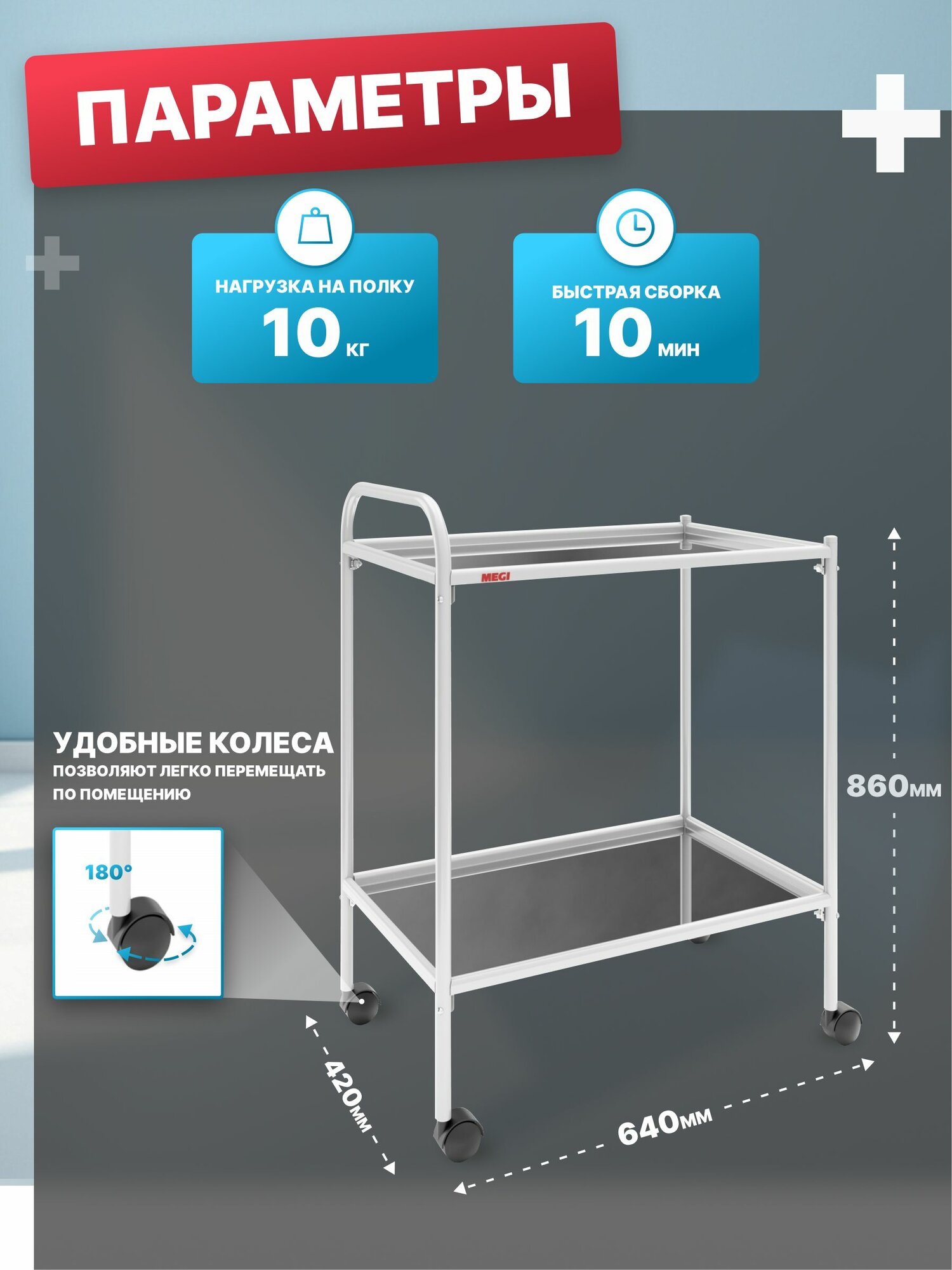 Тележка внутрибольничная предназначена для размещения инструментов, приборов разных назначений, лекарственных препаратов, также для оснащения салонов красоты, тату салонов, стоматологических, смотровых кабинетов больниц и поликлиник.