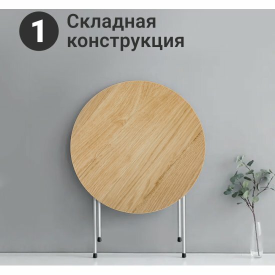 В собранном состоянии стол практически не занимает места. Высота столика в разложенном виде 50 см, диаметр 60 см.