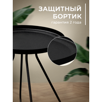 Столик оснащен круглой металлической столешницей и четырьмя металлическими ножками. Максимальная статическая нагрузка составляет 5 кг, а каркас выполнен из трубы диаметром 10 мм.