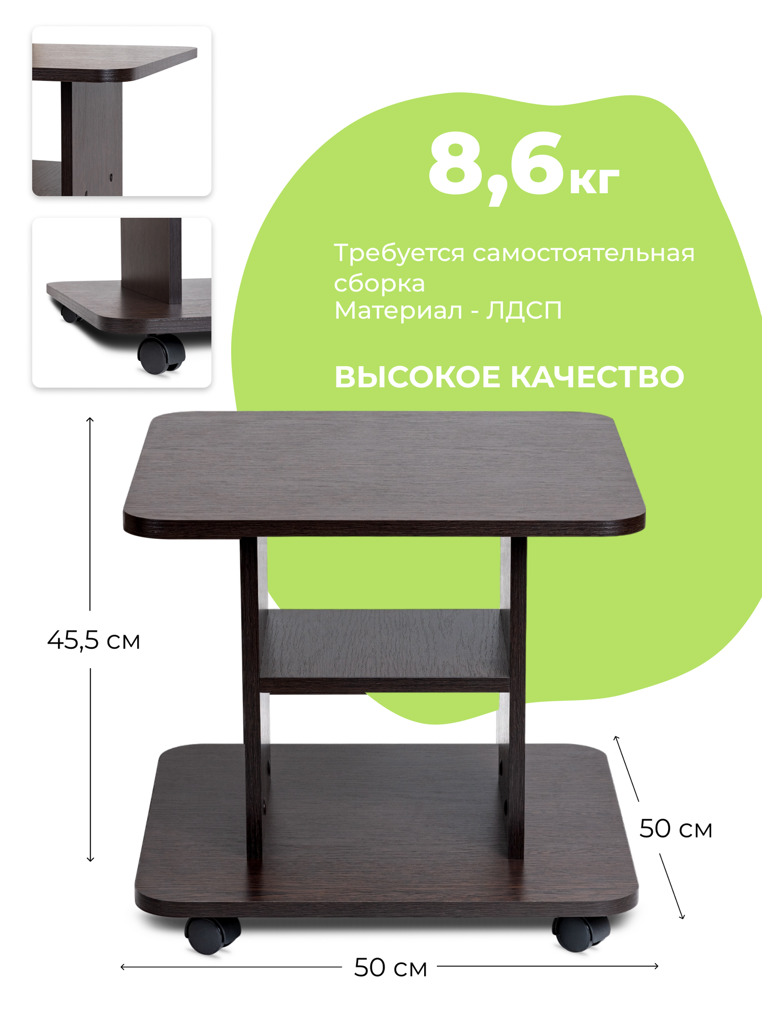 Столик имеет компактные размеры (ширина 50 см, длина 50 см и высота 45 см), что позволяет разместить его даже в небольших помещениях. Материал столешницы и основания – ЛДСП, который отличается прочностью и долговечностью.