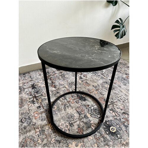 Стол журнальный Размеры: диаметр 45 см, высота 55 см. Материал столешницы- Керамогранит BLACK - керамогранит черный с белыми прожилками, глянцевый. Столешница вставлена внутрь профиля. Основание: металлический профиль, сечение 15/15 или пруток 12 мм. Цвет основания: черный матовый, покраска порошковая. Керамогранит - красивый и прочный материал, имитирующий фактуру мрамора. Устойчив к царапинам, пятнам. Рисунок столешницы различается в каждом конкретном изделии ввиду уникальности и неповторимости материала. Рекомендации по уходу: уборка влажной тряпочкой без использования агрессивных моющих средств.