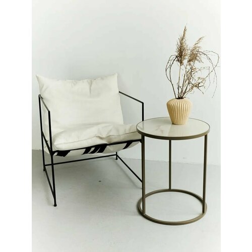 Столешница столика изготовлена из керамогранита ONIX, который имитирует фактуру мрамора. Этот материал отличается своей прочностью и устойчивостью к царапинам и пятнам. Глянцевая поверхность столешницы придает ей элегантный вид, а легкая текстура камня оникс добавляет изысканности.